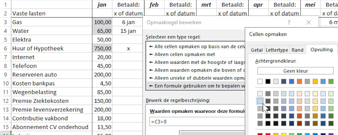 Wil je grip krijgen op je uitgaven, dan is het een goed idee om je vaste lasten en variabele kosten bij te houden. Dat doe je natuurlijk in Excel. In dit artikel leer je hoe je bedragen automatisch laat verkleuren, zodat je meteen ziet hoe je ervoor staat. Dit werkt door middel van de optie voorwaardelijke opmaak in Excel.