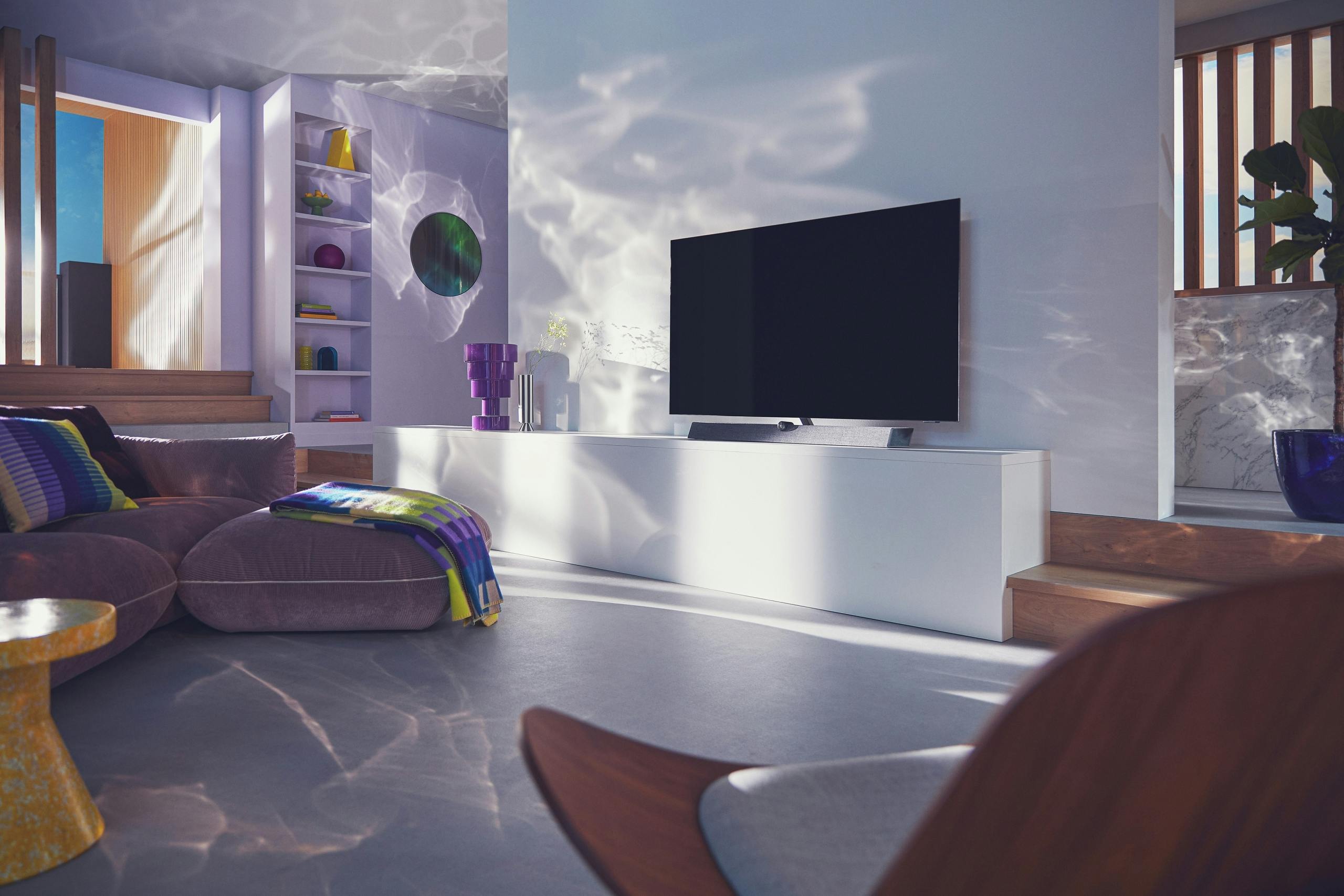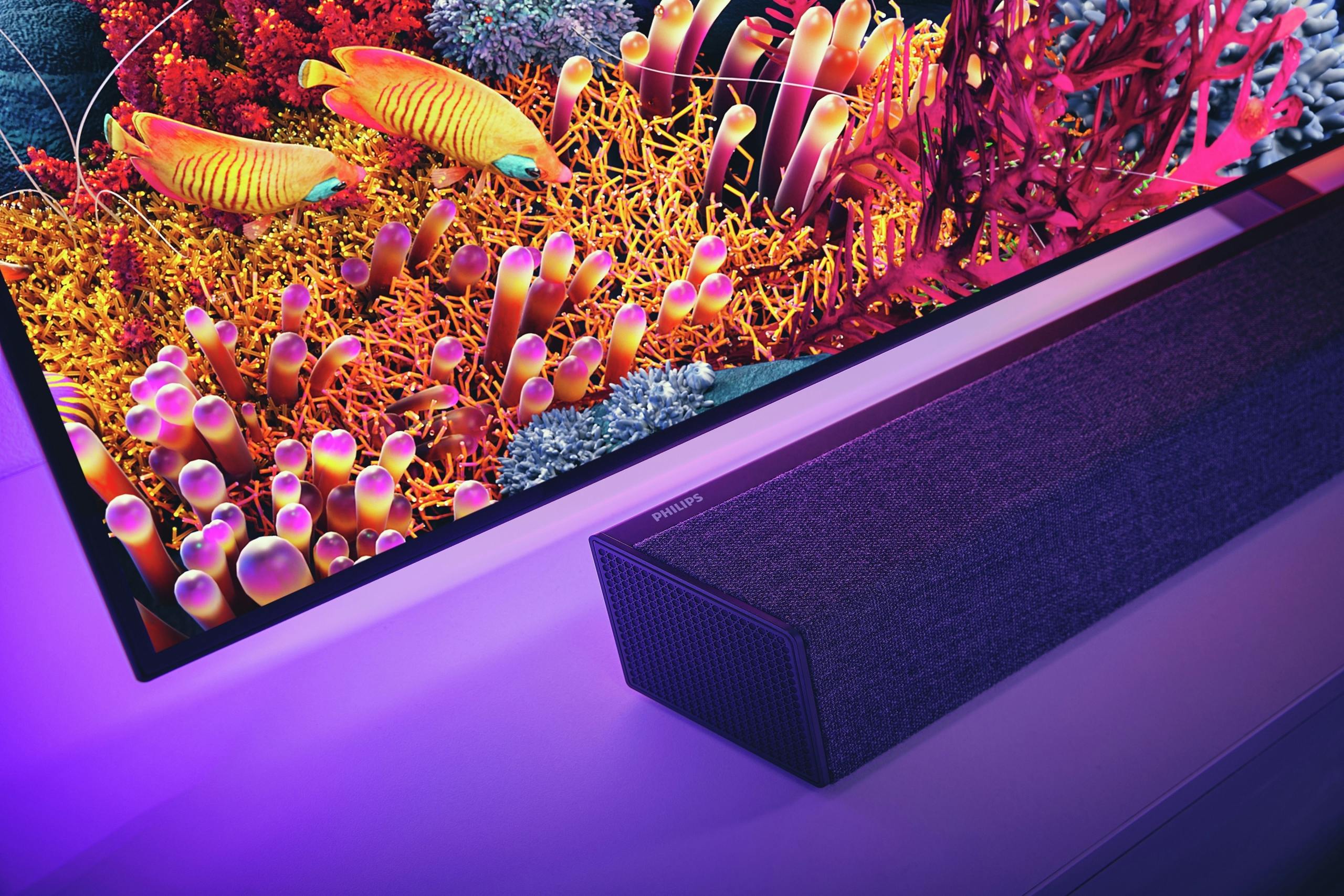 Die luidsprekerbalk onderaan de tv is niet alleen een blikvanger, het is ook een indrukwekkende audio-oplossing. Je herkent de Bowers & Wilkins signature ‘Tweeter-on-top’, die zorgt voor kristalheldere dialogen. Daarnaast bouwde de Britse fabrikant verder op het ontwerp van vorig jaar, met drie tweeters, vier midrange speakers, een krachtige woofer, en twee opwaarts gerichte Dolby Atmos speakers. Dat werd nog verder uitgebreid met twee extra zijwaarts gerichte speakers.