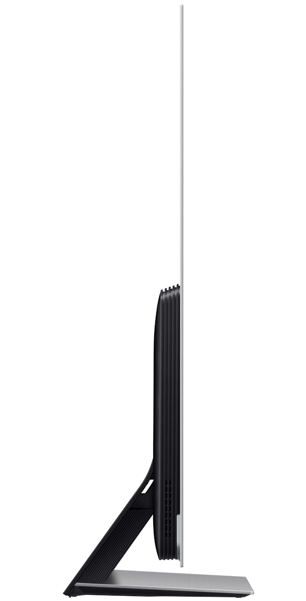 Als het van Samsung afhangt, erg slank. Het scherm zelf is zo dun, en deze 65 inch-versie is zo groot, dat het scherm zelf licht begon te buigen, en sterk wiebelt als je het verplaatst. Wat extra voorzichtigheid is dus geboden. De afwerking is piekfijn in orde. Een fijn zilverkleurig kader omlijst het beeld. De tv staat op een vrij grote centrale voet, met een brede nek die voldoende stabiliteit biedt.