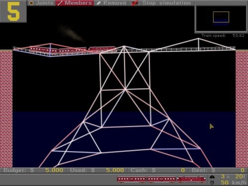 Met de opkomst van het spoor moesten er ook bruggen worden gebouwd die de zware stoomlocomotieven en hun wagons konden dragen. Dat het berekenen van zo’n constructie niet meeviel bleek wel toen in 1879 de Tay Rail Bridge bij het Schotse Dundee tijdens een storm instortte terwijl er een trein op reed. Denkt u het beter te kunnen dan de ingenieurs van toen? Dat kunt u dan bewijzen in het constructiespel Bridging the Gap. Hierin moet u twee oevers van een rivier met elkaar verbinden, waarbij u zo weinig mogelijk kosten moet maken. Is uw bouwwerk klaar dan laat u de trein rijden en hoopt op een goede afloop.