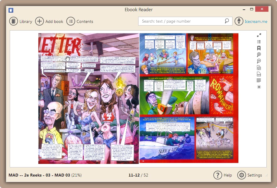 Calibre is een van de bekendste gratis e-readers voor de pc. Met Calibre is absoluut niets mis, maar Gert Rave tipte ons over een programma dat wel eens een geduchte concurrent zou kunnen worden. Het heet simpelweg Ebook Reader en werkt buitengewoon aangenaam. Het toevoegen van boeken aan de bibliotheek is uiterst simpel en het programma kan met veel gangbare formaten uit de voeten waaronder strips in het populaire cbr-formaat. Bladeren gaat lekker snel en uiteraard kunt u de weergave aanpassen, bladwijzers plaatsen, op tekst zoeken en ga zo maar door. Een heerlijke e-reader!