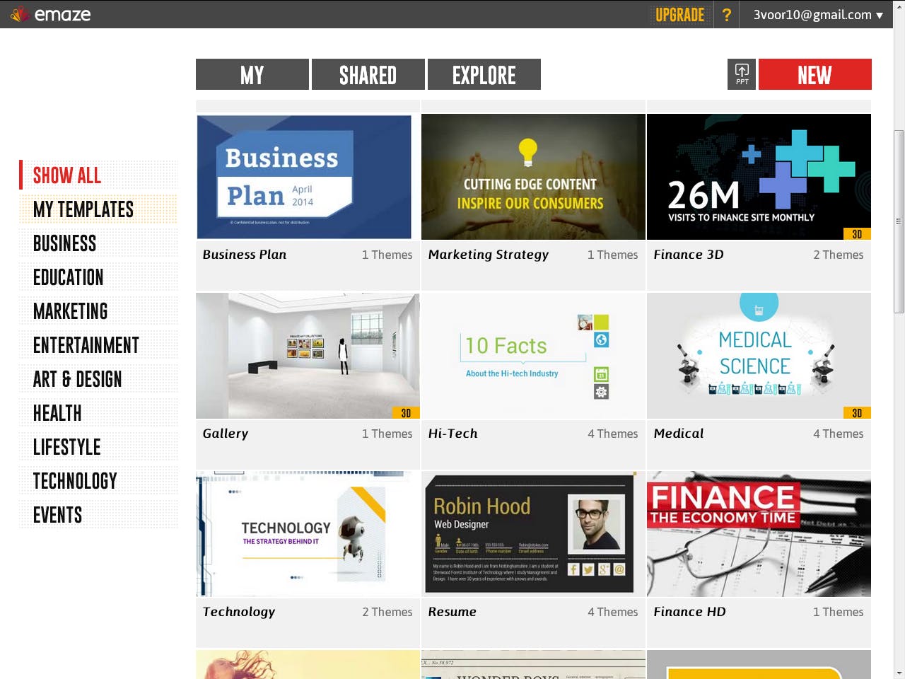 Powerpoint was jarenlang de standaard voor het maken van presentaties maar ondertussen hebben we via internet veel meer en veel leukere mogelijkheden, bijvoorbeeld bij emaze.com. Op deze site kunt u – na gratis registratie – de fraaist denkbare presentaties maken op basis van een enorm aantal sjablonen waaronder een heus 3-museum. Gemaakte presentaties kunt u eenvoudig delen op allerlei sociale media. Het enige nadeel van de gratis versie zijn de beperkte opslagruimte (200 MB) en het feit dat al uw presentaties openbaar zijn maar zolang u met Emaze geen geheimen openbaart mag dat geen probleem zijn.