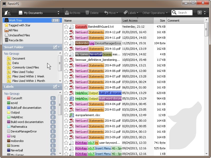 FenrirFS richt zich niet op de locatie van bestanden, maar op hun naam en inhoud. Die werkwijze is vergelijkbaar met die van fotobeheerders zoals Picasa. Fenrir doet dit echter voor al uw bestanden. Aan elk bestand worden automatisch labels toegekend op basis van de naam en het type. U kunt daar uw eigen labels (zoals een waardering) aan toevoegen en hiermee vindt u snel elk bestand terug.