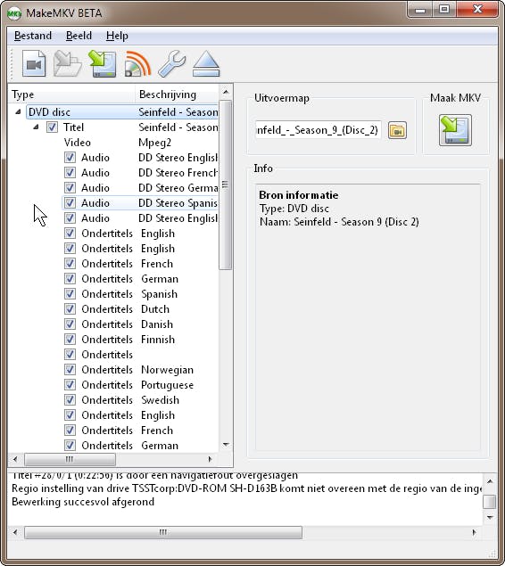 Een eenvoudig programma om deze klus te klaren is MakeMKV, een tip van Jurjen Bakker. MakeMKV analyseert uw schijfjes en geeft een gedetailleerd overzicht van alles wat er op staat aan beeld, geluid en ondertiteling. Elk van die componenten kunt u individueel selecteren zodat u mooi van die Finse ondertitels en die Duitse nasynchronisatie af kunt komen. Vervolgens wordt met één muisklik razendsnel het gewenste mkv-bestand gemaakt.