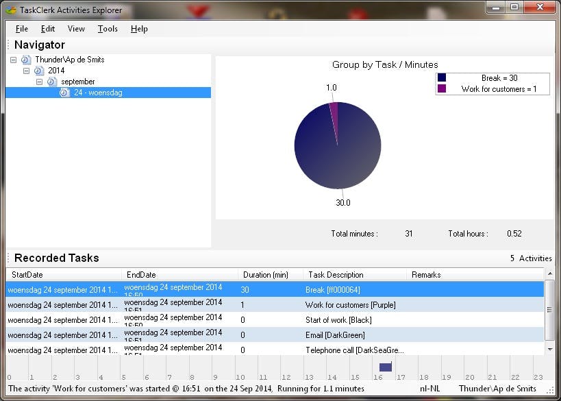 Eerder zagen we al een schitterend programma om uit te vinden waar uw pc het zo druk mee heeft. Maar hoe zit het met úw activiteit achter de computer? Zeker wanneer u het apparaat zakelijk gebruikt, is het vaak nodig om vast te leggen hoeveel tijd u aan welke klus besteedt. Hierbij kan TaskClerk u goede diensten bewijzen. In dit programma – een tip van Linda de Waal – kunt u aangeven wanneer u een bepaalde activiteit start en stopt. TaskClerk slaat dit alles op en vervolgens kunt u op basis van die opgeslagen gegevens allerlei rapporten en grafieken genereren en eventueel exporteren.