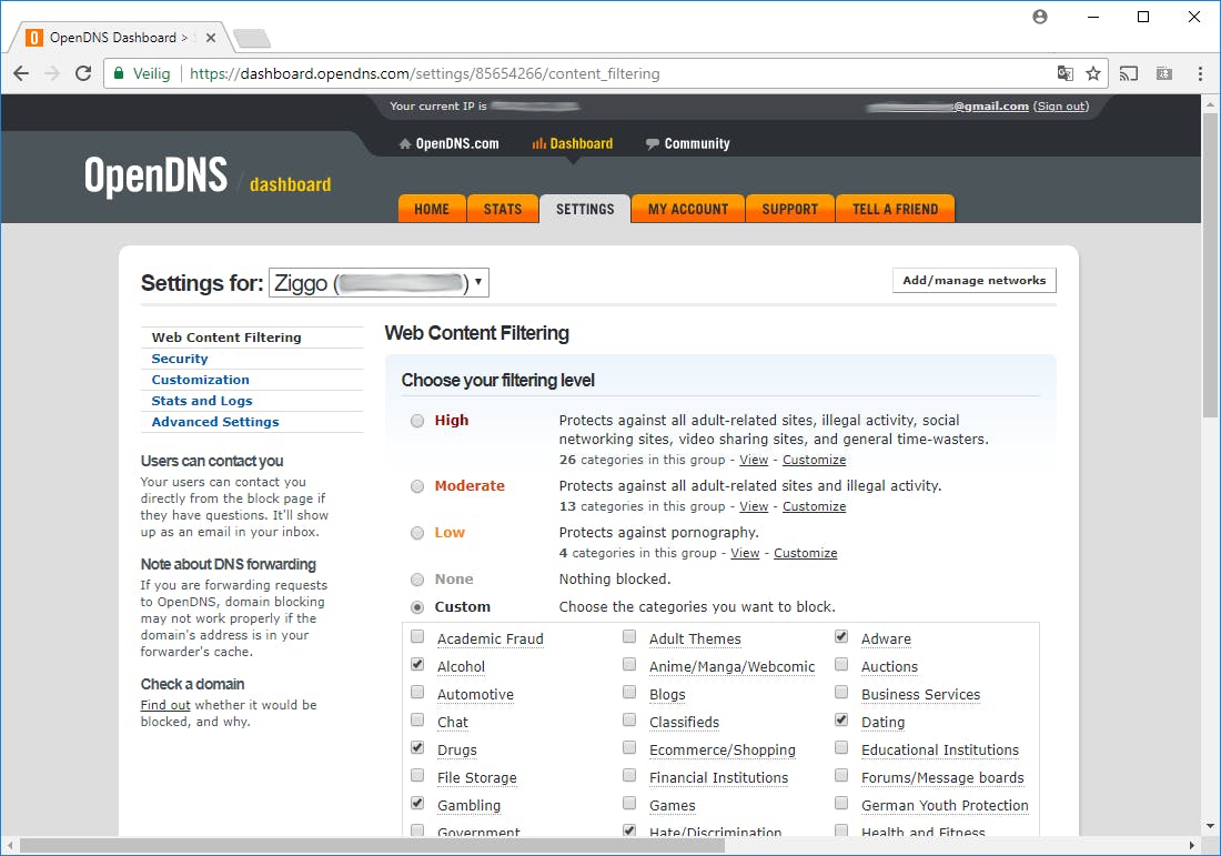Heeft je router geen mogelijkheden voor het filteren van je netwerkverkeer? Dan kun je met OpenDNS toch inhoudsfiltering toevoegen. Hiervoor stel je de dns-serveradressen van OpenDNS centraal op je router in. Ieder apparaat zal dan verbinding maken via de dns-server van OpenDNS. De eenvoudigste methode is wat OpenDNS ‘Family Shield’ noemt. Dit zijn dns-servers die bepaalde schadelijke inhoud altijd blokkeren. De ip-adressen van Family Shield zijn 208.67.222.123 en 208.67.220.123. Je kunt met OpenDNS ook zelf bepalen welke inhoud gefilterd moet worden. Hiervoor gebruik je de standaard ip-adressen van Open DNS: 208.67.222.222 en 208.67.220.220. Maak hiervoor een account aan. Gebruik in de instellingen van je router de net genoemde standaard ip-adressen van OpenDNS. Het OpenDNS-aaccount is gekoppeld aan het ip-adres van je internetverbinding. Wanneer dat ip-adres wijzigt – na bijvoorbeeld een storing – zullen de zelf gekozen filterinstellingen niet meer actief zijn. OpenDNS heeft een programma voor de pc dat automatisch het ip-adres in je account bijwerkt als het ip-adres van je internetverbinding wijzigt. OpenDNS Updater is beschikbaar voor Windows, maxOS en Linux. Op zich werkt het OpenDNS-filter voor de eindgebruiker hetzelfde als een ingebouwd filter in een router. Er is alleen één groot nadeel: deze vorm van filtering is eenvoudig te omzeilen door op een client een andere dns-server in te stellen.