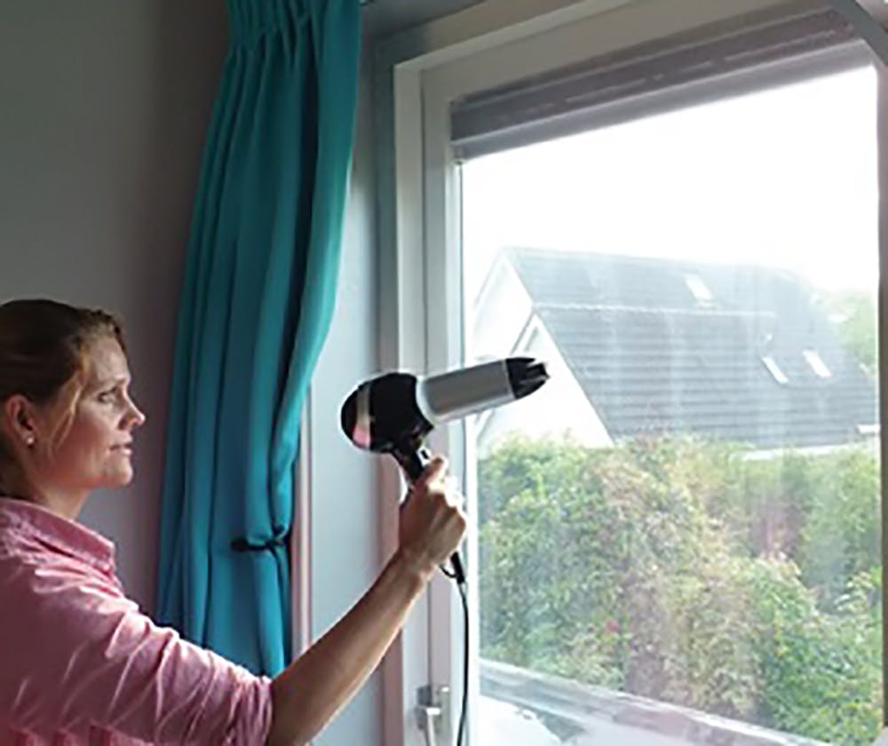 Kozijnfolie is een typisch doe-het-zelfproduct. Je plakt eerst de tape op het kozijn, vervolgens meet je het raam op en knip je de folie ruim op maat. Dat wil zeggen dat je aan elke kant zo’n 5 cm extra overhoudt. Daarna begin je bij de bovenkant; daar haal je eerst de beschermlaag van de dubbelzijdige tape zodat je de folie aan het kozijn kunt plakken. Daarna haal je de zijkanten los en ook daar plak je de folie aan de kozijnen. Ten slotte doe je hetzelfde met de onderkant.