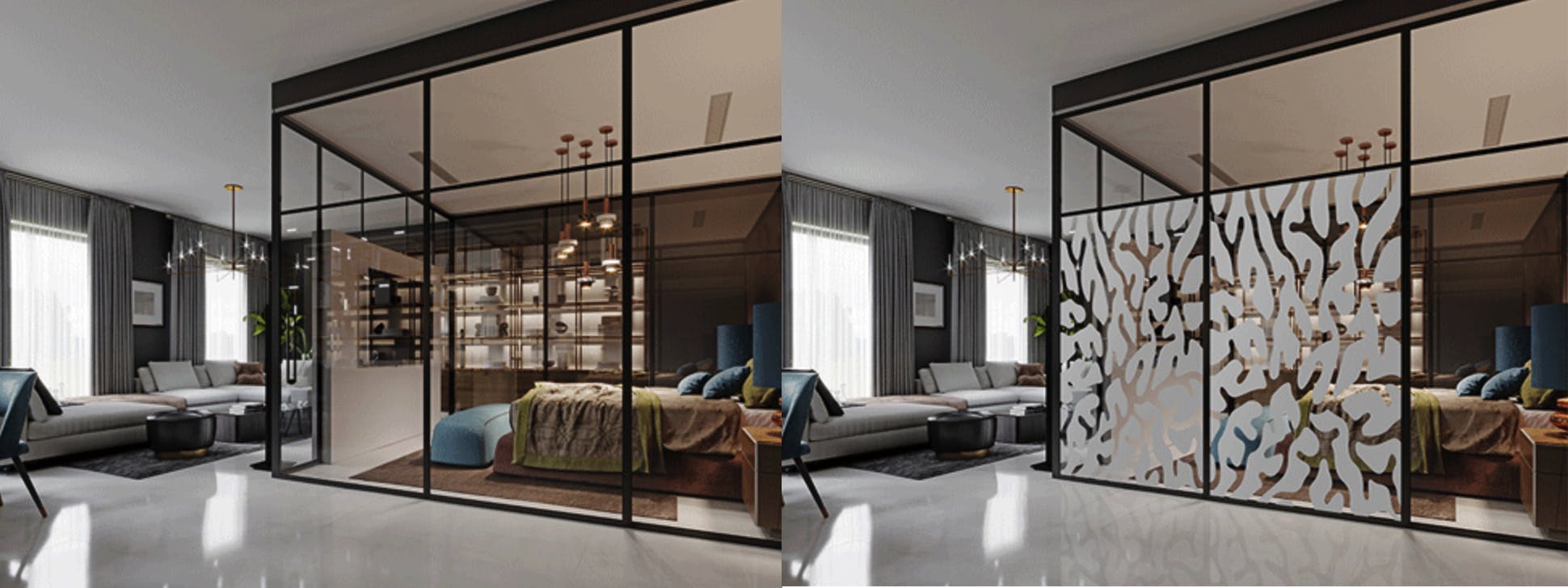 Het neusje van de zalm is E-film, of slim glas. Dit product is ook een folie met PDLC-technologie (Polymer Dispersed Liquid Crystal) in breedtes van 180 cm dat je in verschillende patronen kunt laten etsen. De E-film zet je ook met een app aan en uit, en is verkrijgbaar in drie uitvoeringen: wit, grijs en zwart.