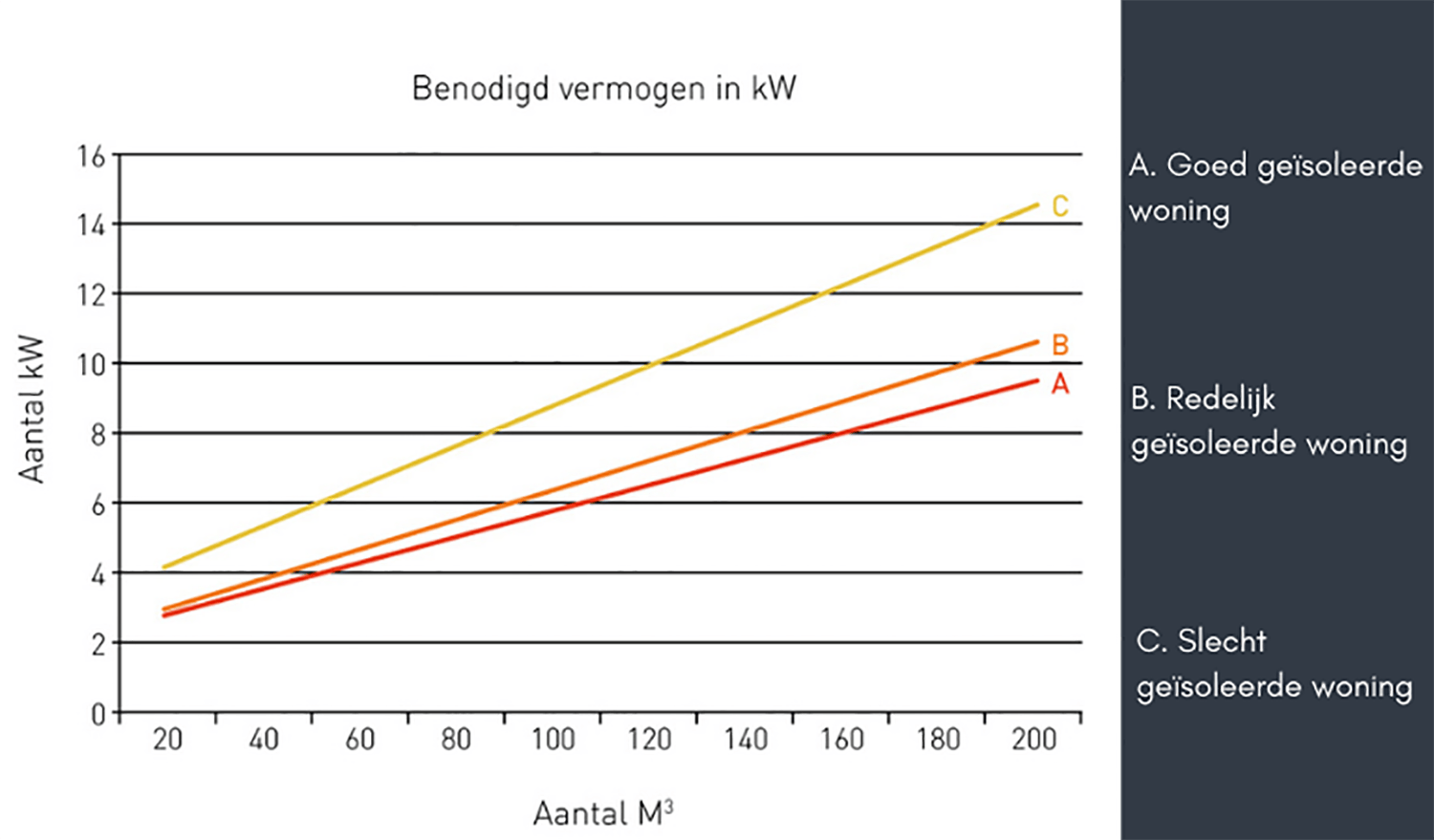 Met het vermogen van de gashaard bedoelen we de maximale warmteopbrengst. Als je een gashaard met een te hoog vermogen kiest, wordt de kamer te warm, en kies je een te laag vermogen dan blijft de kamer te koud als je die volledig met de gashaard zou verwarmen. De volgende grafiek helpt bij de keuze van het vermogen. Je rekent eerst het volume van de kamer uit en vervolgens kun je op basis van deze grafiek het vermogen aflezen voor een slecht geïsoleerde woning, een matig geïsoleerde woning en een goed geïsoleerde woning.