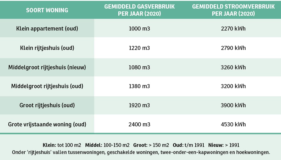Je kunt ook kijken naar de cijfers van het Centraal Bureau voor de Statistiek (CBS). In de tabel zie je wat in 2020 het gemiddelde verbruik voor een aantal verschillende huishoudens en woningen was. Wil je deze cijfers kunnen gebruiken, dan moet je wel in een door aardgas verwarmd huis wonen. In Nederland geldt dat voor ruim 88 procent van de woningen.