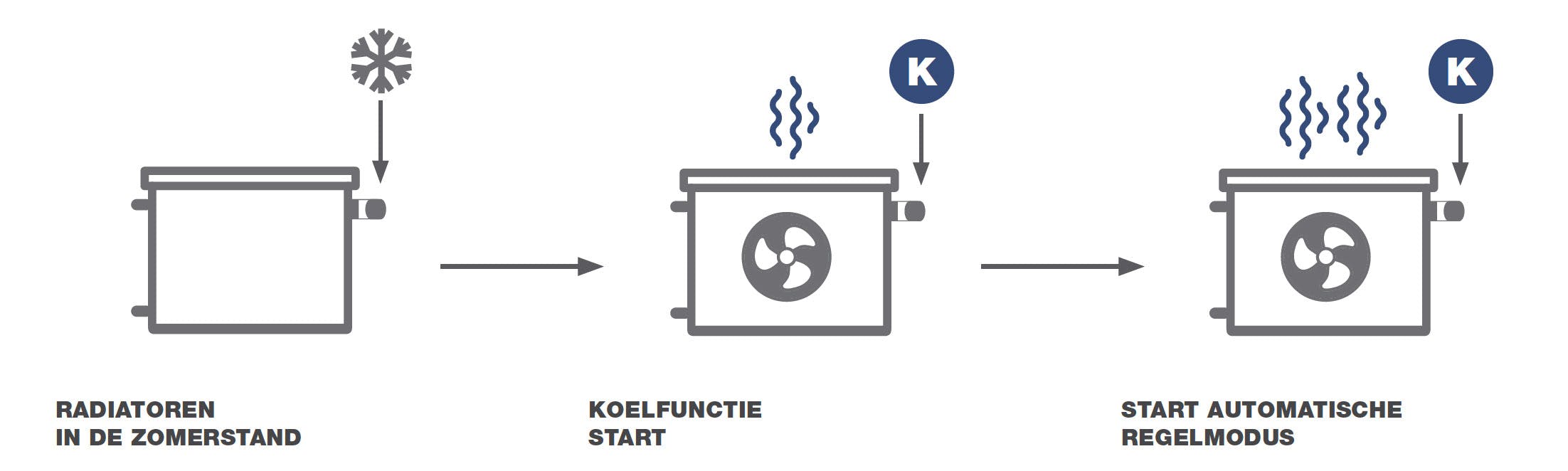 Als je deze nieuwe radiator op een systeem met een warmtepomp aansluit, kun je deze LTV-radiator ook gebruiken om te koelen. Wanneer het buiten 28 graden is en je wilt de slaapkamer koelen, dan zet je het toestel op de K-stand. Daarna zorgt het cv-water met een aanvoertemperatuur tot maximaal 17 graden Celsius voor verkoeling. Ook het koelen wordt trouwens automatisch geregeld.