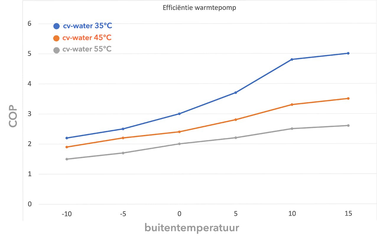 Het rendement van een warmtepomp neemt af bij lagere temperaturen, vooral als de buitentemperatuur onder het vriespunt zakt. Hieronder zie je de grafiek van een fictieve warmtepomp (lucht-water). Je ziet drie curves van dezelfde warmtepomp die het rendement tonen wanneer het cv-water wordt ingesteld op 35°C, 45°C en 55°C.