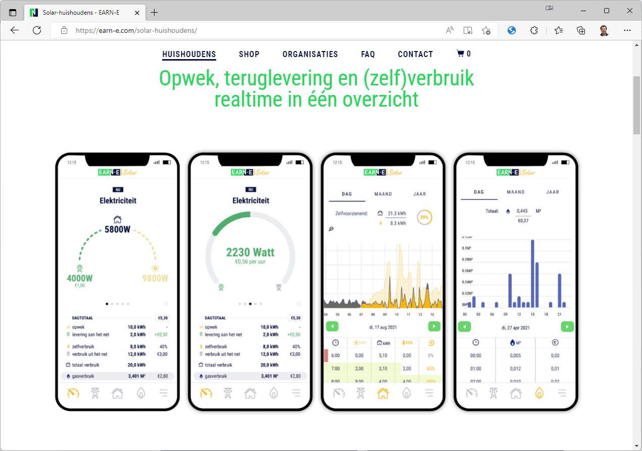 De EARN-E is een meetstekker die je net als het apparaatje van HomeWizard in combinatie met een app kunt gebruiken voor inzicht in je verbruik. Tevens kun je inloggen op het desktopportaal met een browser. Naast de eenmalige aanschafprijs (29,95 euro) heb je ook een abonnement nodig van 1 euro per maand. Voor eigenaren van zonnepanelen is het EARN-E Solarpakket waarschijnlijk interessanter. De abonnementskosten van deze variant zijn wel iets hoger (2,50 euro per maand). De Solar-variant kun je koppelen met verschillende omvormers van zonnepaneelinstallaties. Op dit moment worden zowel SolarEdge als Enphase ondersteund. De koppeling met SMA en GoodWe wordt nog ontwikkeld. Deze koppeling gebeurt softwarematig waardoor er niets hoeft te worden geïnstalleerd. De belangrijkste toegevoegde waarde is natuurlijk dat je hiermee óók de opwek kunt zien van je zonnepanelen in hetzelfde overzicht. Binnenkort levert EARN-E een optioneel schermpje als extra uitbreiding op bovenstaande pakketten om je verbruik mee te kunnen volgen.