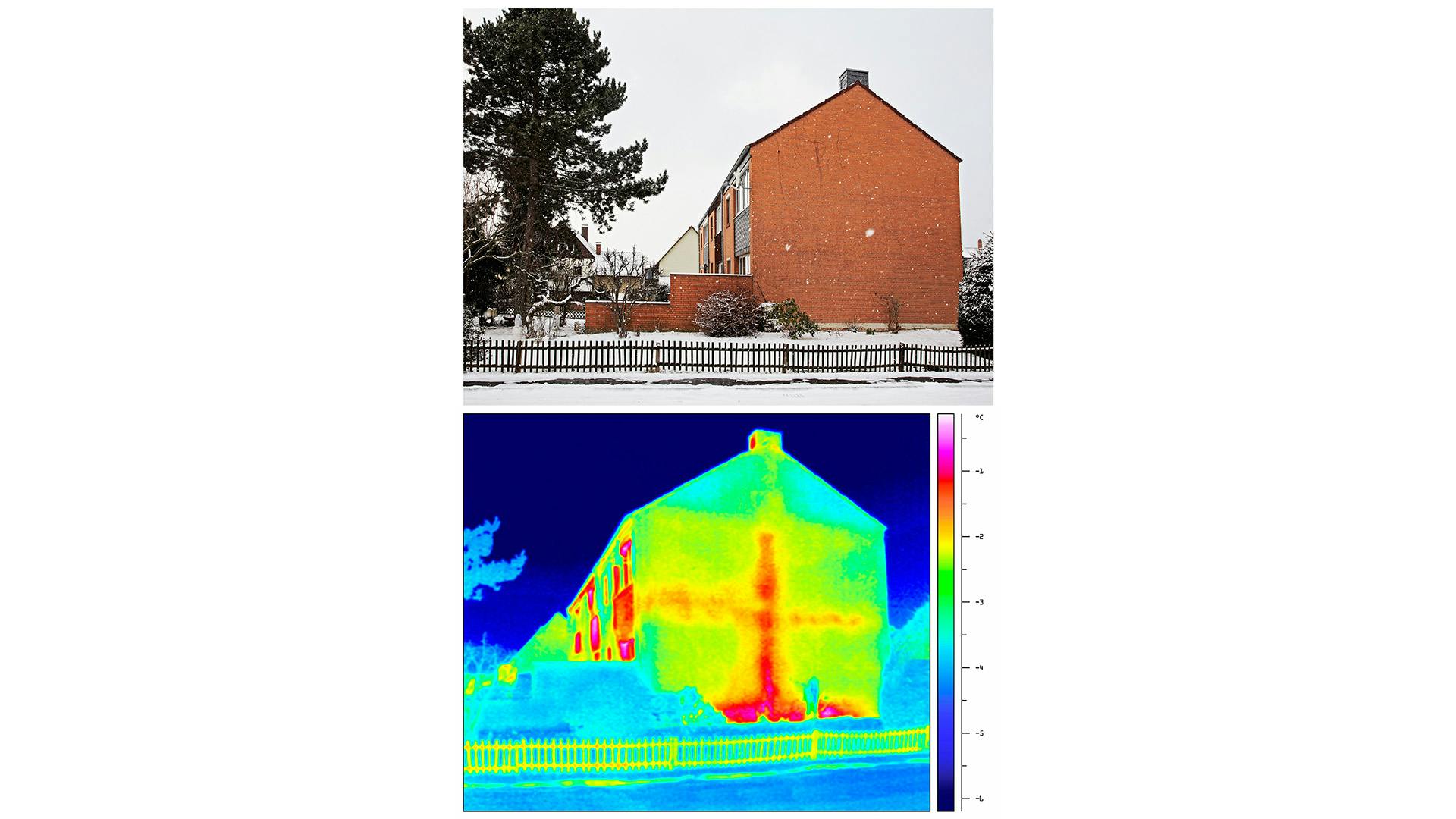 Met deze camera fotografeert de expert de oppervlakken. Het resultaat is een foto die door middel van kleuren aangeeft waar de warmtelekken en koudebruggen zitten. Hoe roder de kleur, hoe warmer het oppervlak en hoe blauwer de kleur, hoe kouder het oppervlak. Voer deze test uit bij koud weer, want de temperatuurverschillen komen het best aan het licht als er minstens 10°C verschil is tussen de binnen- en de buitentemperatuur. Daarna maakt de expert thermische foto’s van de buitengevels. De zones waar de warmte ontsnapt, zul je aan de rode kleur herkennen.