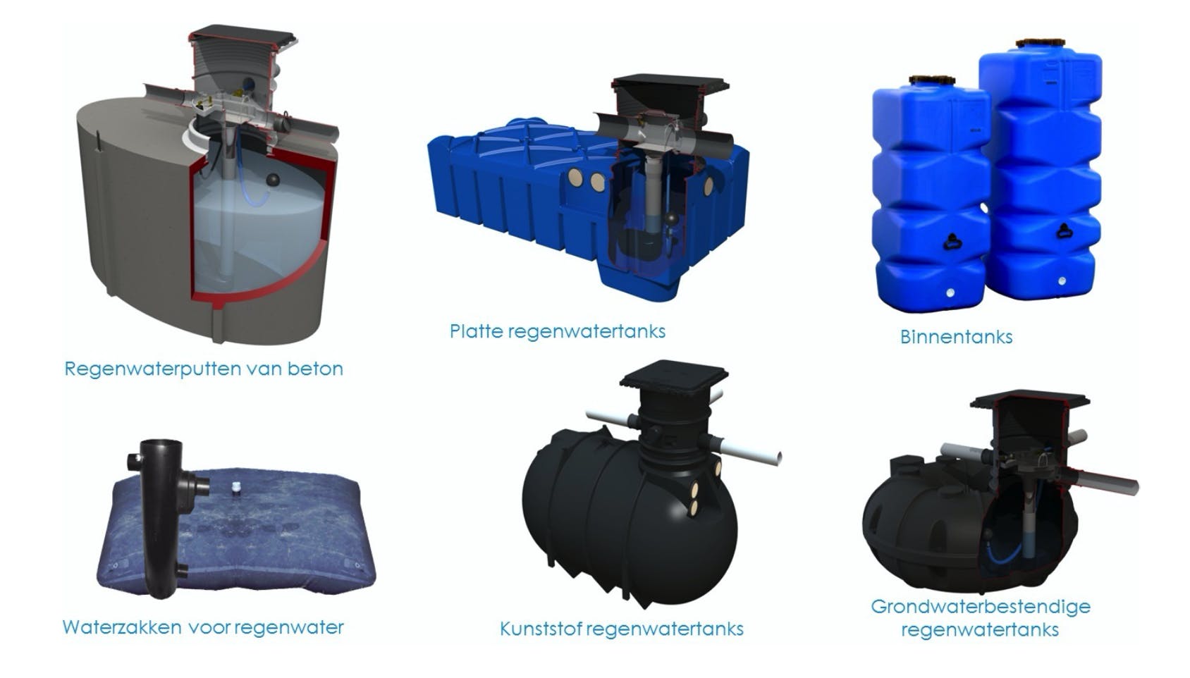 Bij voorkeur bestaat zo’n tank uit beton. De samenstelling van beton maakt het regenwater nog zachter en natuurlijke zuurtegraad wordt geneutraliseerd. Dit heeft het voordeel dat het regenwater minder hard is voor de leidingen en toestellen. Er zijn ook geprefabriceerde kunststoffen tanken die verstevigingsribben bevatte. Ook dit type wordt meestal ingegraven. Zelden zie je nog een gemetste regenwaterput of een deel van de kelder dat wordt uitgevoerd als wateropslagplaats.