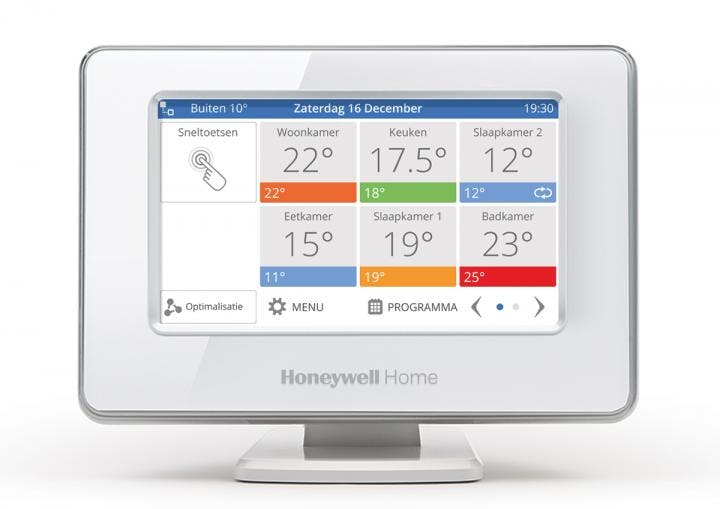 Bosch heeft met de EasyControl een slimme thermostaat die met de meeste cv-ketels kan samenwerken. Net als de Tado kun je ook bij dit systeem de temperatuur in afzonderlijke ruimtes regelen door slimme radiatorknoppen te installeren, waarop je eventueel ook direct de temperatuur kunt instellen. Bij Evohome van Honeywell zijn zulke instelbare radiatorknoppen eveneens een belangrijk element. Al sinds de introductie zo’n acht jaar geleden is Evohome geschikt voor een zoneregeling. Het is nog steeds aan van de meest complete en gebruiksvriendelijke opties voor dat doel, al betaal je er wat meer voor. Voor de bediening kun je een centraal bedieningspaneel met schermbediening gebruiken, maar ook gewoon een browser of app.