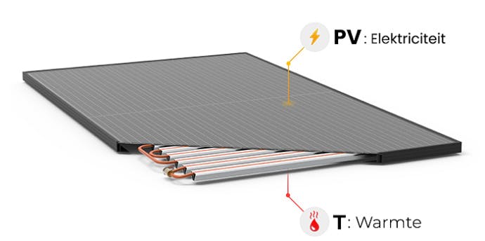 Een PVT-systeem bestaat uit een PVT-warmtepomp die in huis staat en PVT-panelen op het dak. Via de dakpanelen kan de warmtepomp energie onttrekken aan drie bronnen: het directe zonlicht, de buitenlucht en het gewone daglicht. Van veraf ziet zo'n PVT-paneel er uit als elk ander zonnepaneel, maar het is opgebouwd uit twee basiselementen.