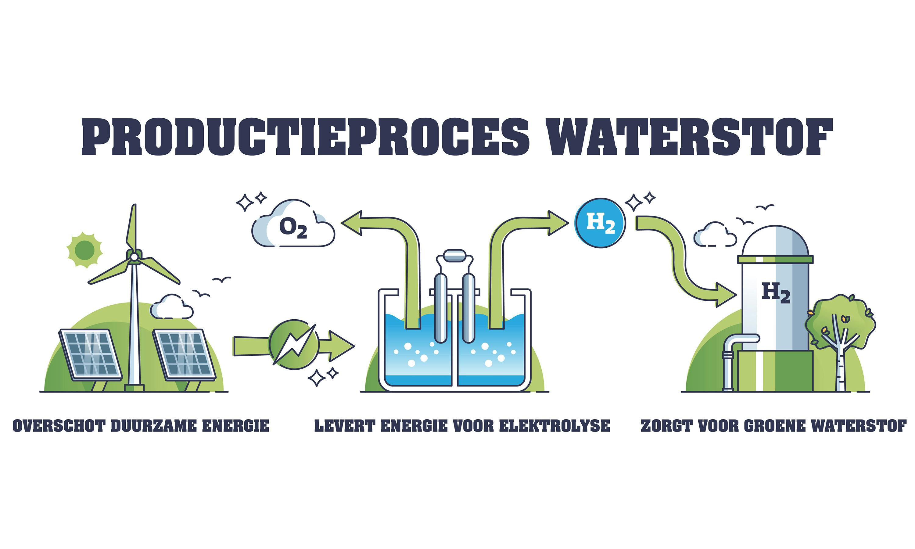 Waterstof is het lichtste en meest voorkomende element in het universum. Het is een kleurloos, geurloos en niet-toxisch gas dat kan worden gebruikt als een schone, duurzame energiebron. Waterstof kan worden geproduceerd uit verschillende bronnen, waaronder aardgas, biomassa en water. Het proces waarbij waterstof wordt geproduceerd uit water wordt elektrolyse genoemd.