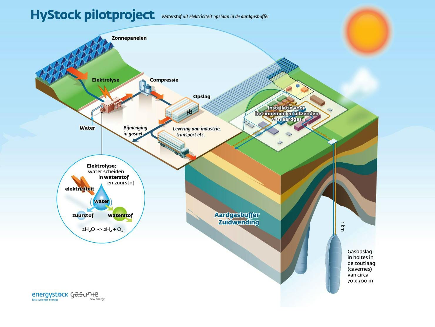 We spreken met de woordvoerder van de Gasunie, de eigenaar van het Nederlandse gastransportnetwerk. “De Gasunie installeerde al in 2019 HyStock, een 1MW Power-to-Gas installatie in Groningen, om duurzaam opgewekte elektriciteit om te zetten in waterstof voor mobiliteit en industrie. In deze waterstoffabriek wordt 99,5 procent zuivere waterstof geproduceerd. De locatie werd gekozen omdat ze ideaal was om waterstof grootschalig op te slaan in speciaal voor gasopslag geschikt gemaakte zoutcavernes. Vanuit HyStock wordt de waterstof naar de verbruikers vervoerd via vrachtwagens met gastubes. Er wordt geen gebruik gemaakt van het gasnetwerk.”