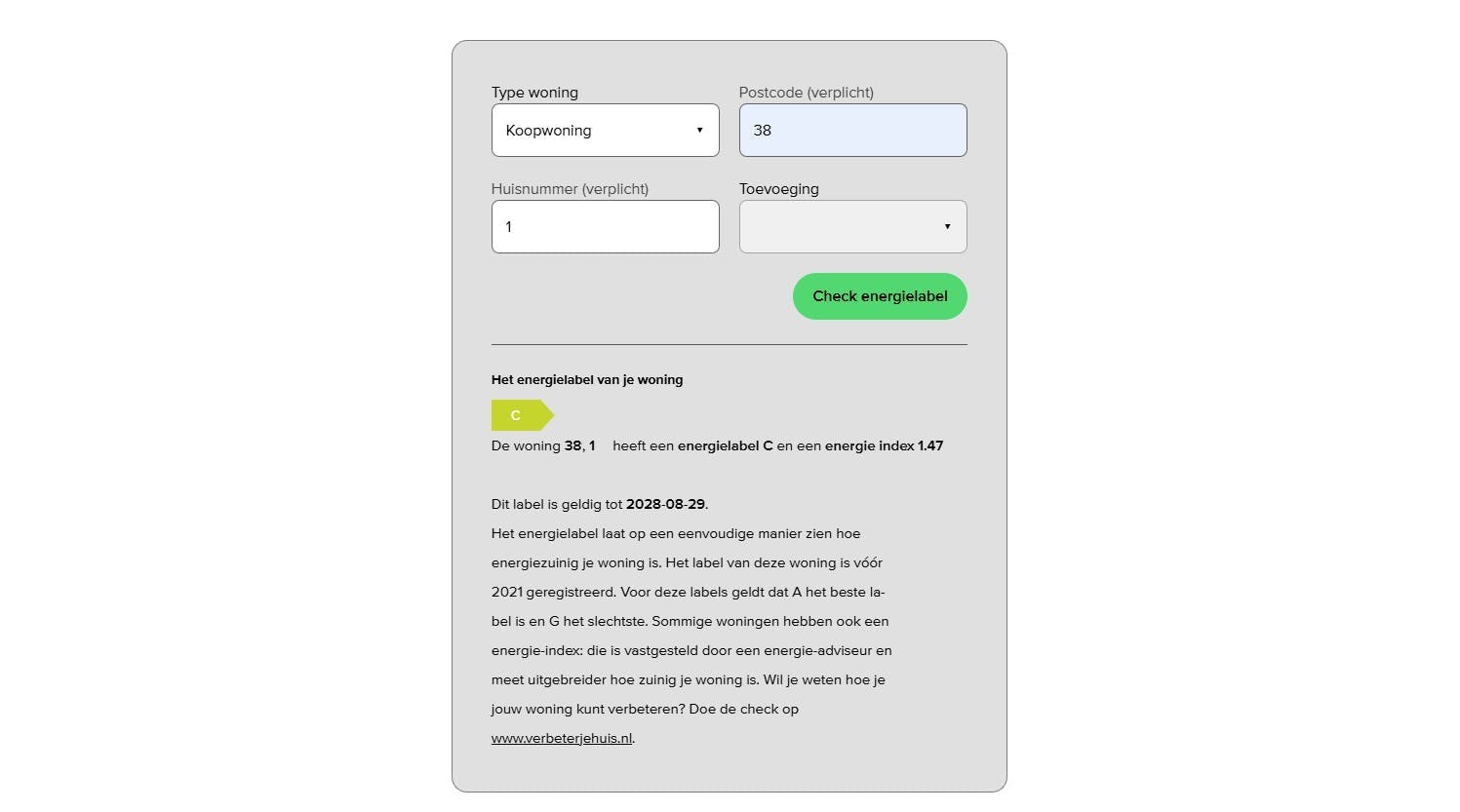 Milieu Centraal heeft een speciale website opgetuigd waarbij je kunt zien welk energielabel jouw woning heeft gekregen. Als je bijvoorbeeld huurder bent kan deze informatie handig zijn, om te zien of een energie(on)zuinige woning ook iets voor de huurprijs kan betekenen. En voor kopers van (nieuwe) woningen kunnen dan eenvoudig achterhalen of de te kopen woning ook voldoet aan de huidige, moderne eisen.