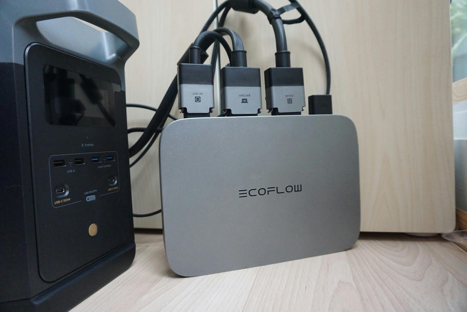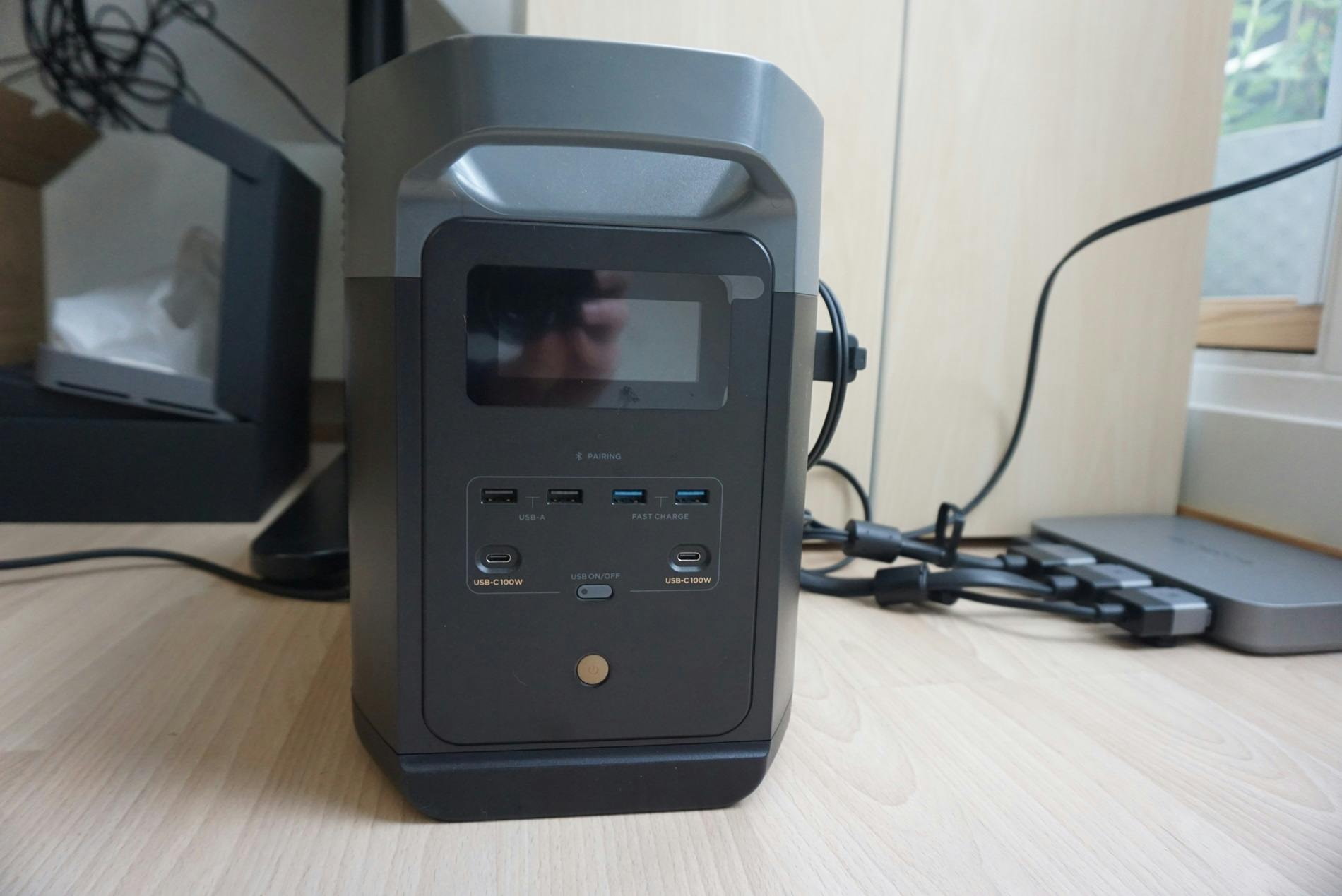 De draagbare accu die in ons pakket hoort, is de Ecoflow Delta 2. Deze accu heeft een capaciteit van 1024 Wh, weegt twaalf kilo en kan zichzelf opladen via het stopcontact (in tachtig minuten) of via zonnestroom. Hoelang het opladen via zonne-energie duurt, is onder meer afhankelijk van welk type zonnepanelen je hebt en de weersomstandigheden, maar duurt zeker een aantal uur. De Delta 2 is voorzien van vier reguliere stopcontacten (totaal 1800 watt output), twee usb-c-poorten met elk 100 watt output en vier usb-a-poorten om eenvoudige gadgets langzamer op te laden.