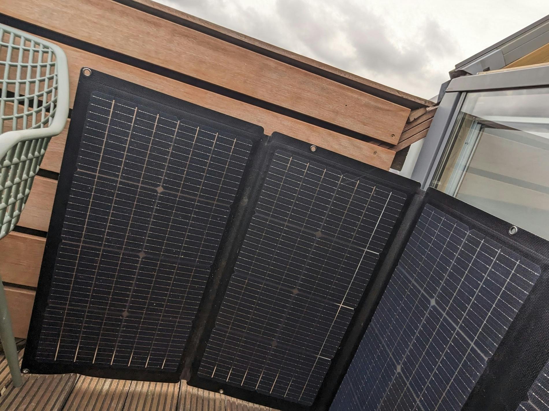 De set draagbare zonnepanelen is ontworpen voor gebruik op een dakterras of balkon en dat zie je aan het ontwerp. In feite heb je één groot zonnepaneel van zestien kilo, dat onderverdeeld is in vier paneelvlakken. Je kunt die vier vlakken vouwen voor wat meer flexibel gebruik, bijvoorbeeld als je balkon wat hoekig is. Je bevestigt het volledige zonnepaneel via meegeleverde tie-wraps aan je balkon. Dit werkt prima en hoewel we in de testperiode geen storm ervaren hebben, hebben we er vertrouwen in dat het systeem ook dan netjes blijft hangen. Het spreekt voor zich dat het zonnepaneel IP68-gecertificeerd is: het is dus stof- en waterdicht.