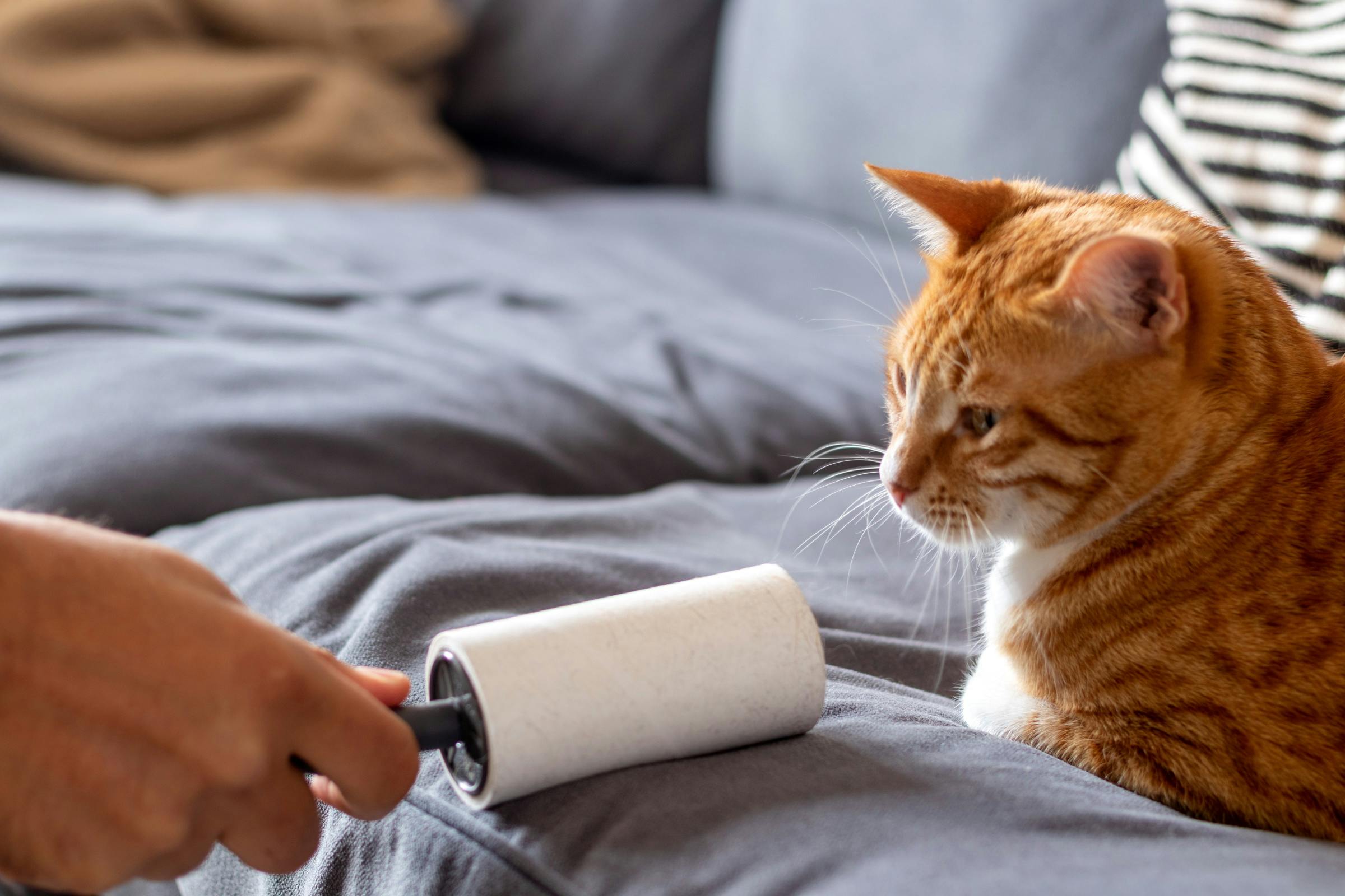 Voor haren die blijven ‘plakken’ op de stoffen bank of je kleding maak je gebruik van een pluizenroller of een stuk tape.