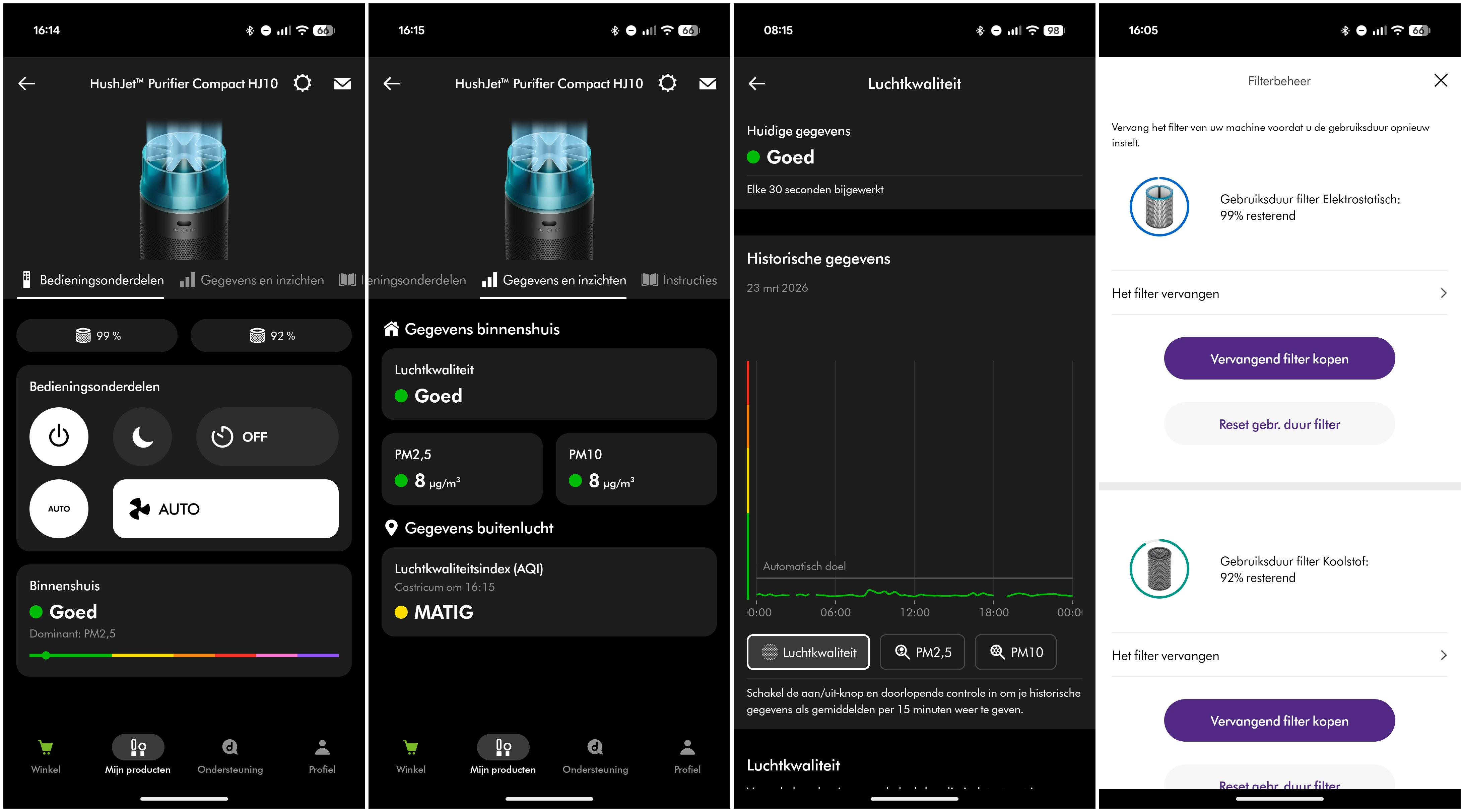 In de app zie je in realtime de luchtkwaliteit van je kamer, net als de historie. Dat laatste is niet mogelijk op het schermpje van de HushJet zelf. Je ontvangt ook elke maand een rapport over de luchtkwaliteit in je ruimte. In de app kun je bovendien wisselen van stand (automatisch, slaapmodus) en de luchtstroomsnelheid aanpassen. Prima, maar dat kan ook op het apparaat zelf.