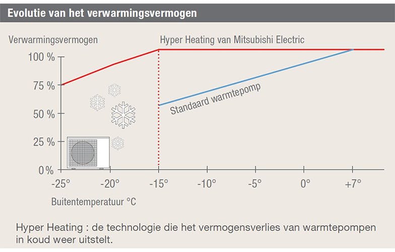 Mitsubishi Electric introduceert Hyper Heating, een airco-technologie waarbij de focus eerder op verwarmen ligt. Dit lucht/luchtsysteem is al langer bekend in Scandinavië en komt nu ook in Nederland in de aandacht. Net als bij iedere airco kun je met deze units koelen, maar ze zijn ook ontworpen om te verwarmen. Zelfs in erg koude situaties en dan spreken we over een buitentemperatuur tot -25 graden. Bij ieder ander aircosysteem dat ook kan verwarmen vermindert het verwarmingsvermogen vanaf plus 7 graden, zodat bij 15 graden vorst slechts de helft van het vermogen overblijft. Hyper Heating kan zelfs bij heel lage temperatuur nog steeds 100 procent van zijn verwarmingsvermogen leveren.