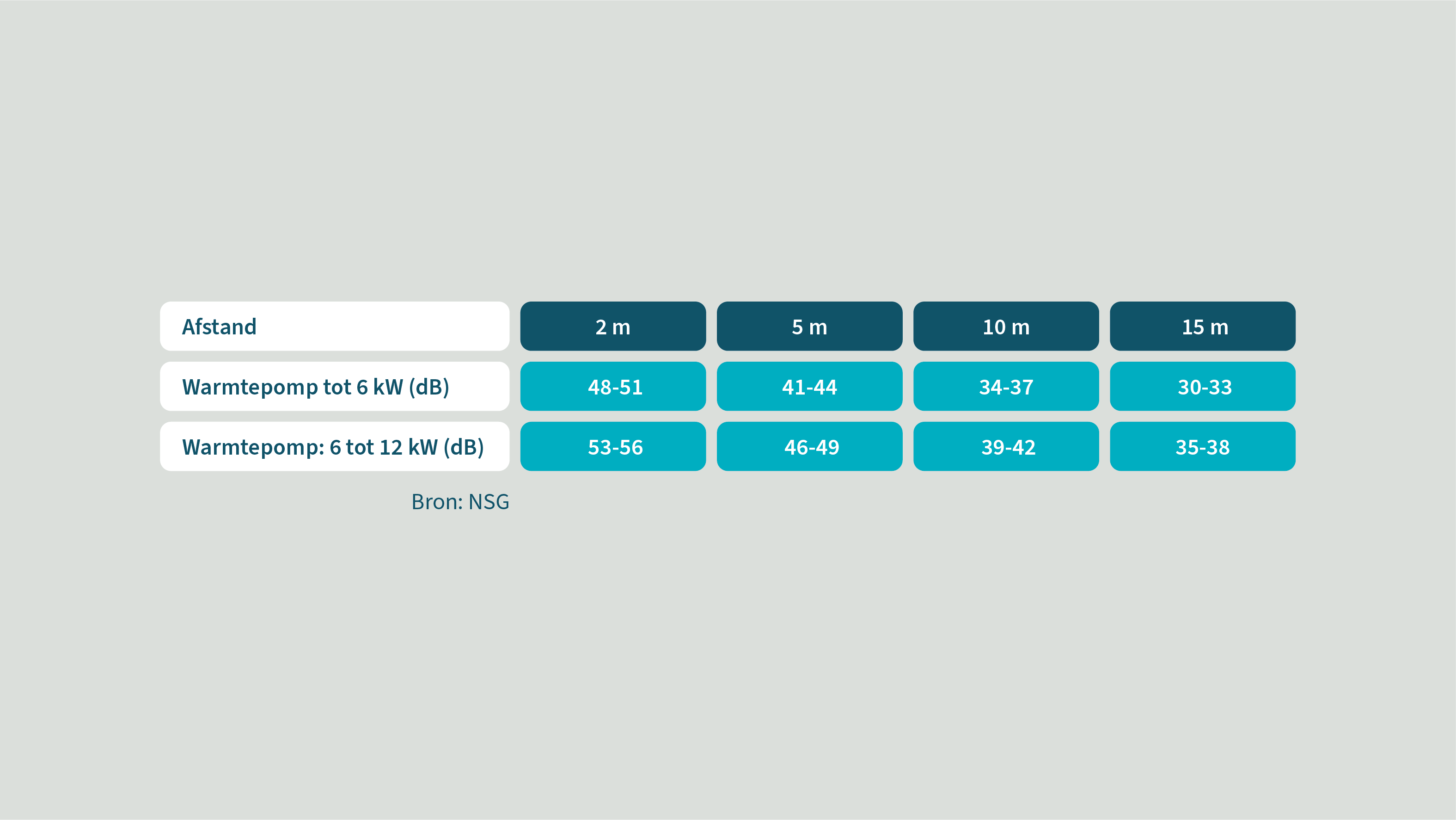 Het is dus van groot belang om de buiten-unit zo gunstig mogelijk op te stellen. Plaats hem dus niet te dicht tegen de erfgrens, want geluid neemt af naar gelang de afstand groter wordt. De Nederlandse Stichting Geluidshinder heeft in het verleden metingen gedaan met lucht-waterwarmtepompen tot 6 kW en van 6 tot 12 kW. In hun tabel lees je hoe het aantal decibels afneemt naarmate de afstand tot de warmtepomp groter wordt.