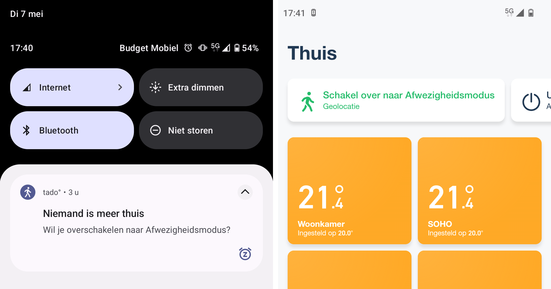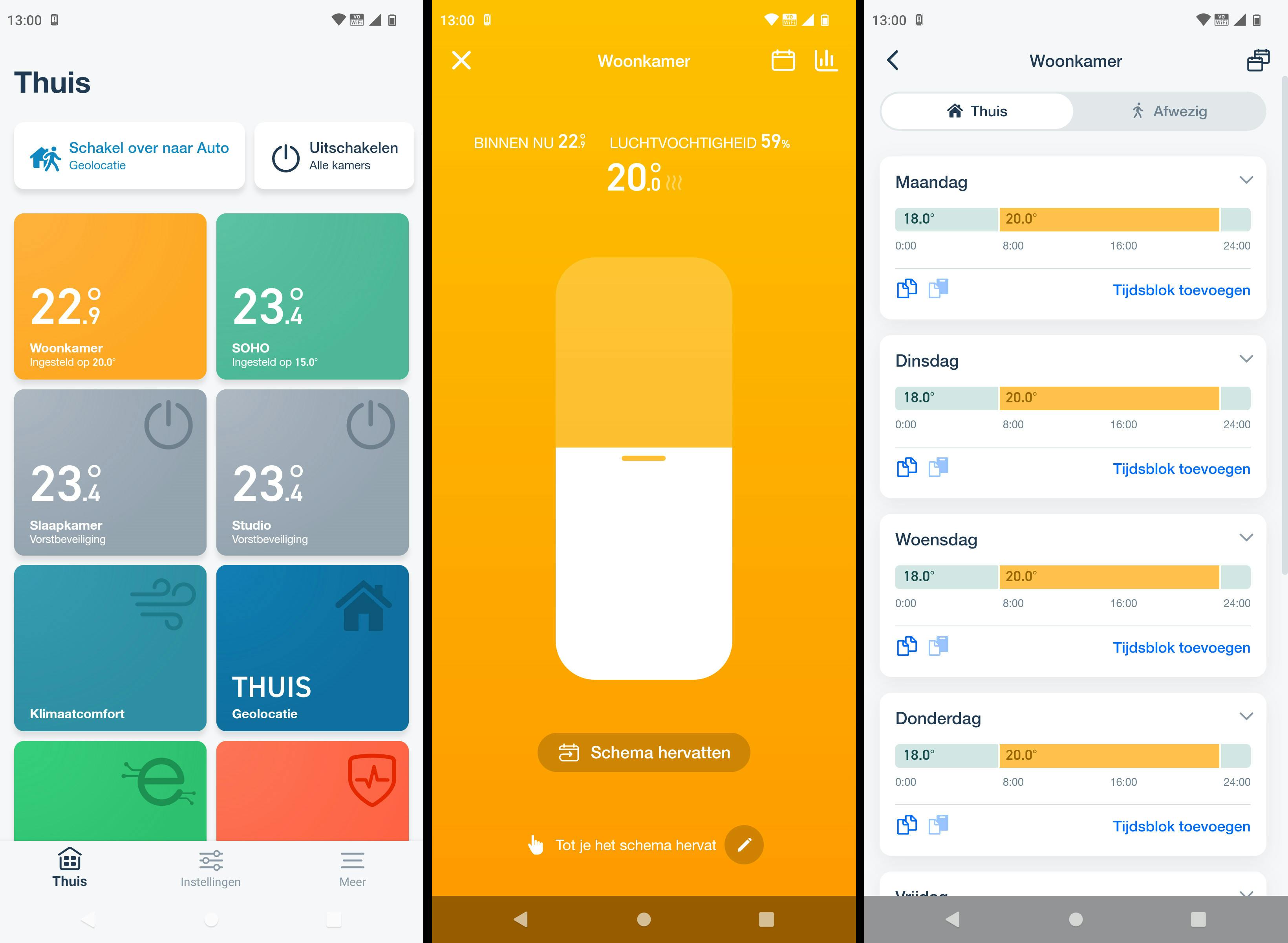 Dat klokprogramma geldt als je volgens de app thuis bent. Voor afwezigheid kun je een afwezigheidstemperatuur instellen. Je kunt de temperatuur uiteraard ook handmatig instellen en aangeven hoe lang het klokprogramma genegeerd moeten worden. Dat negeren kan ook onbeperkt.
