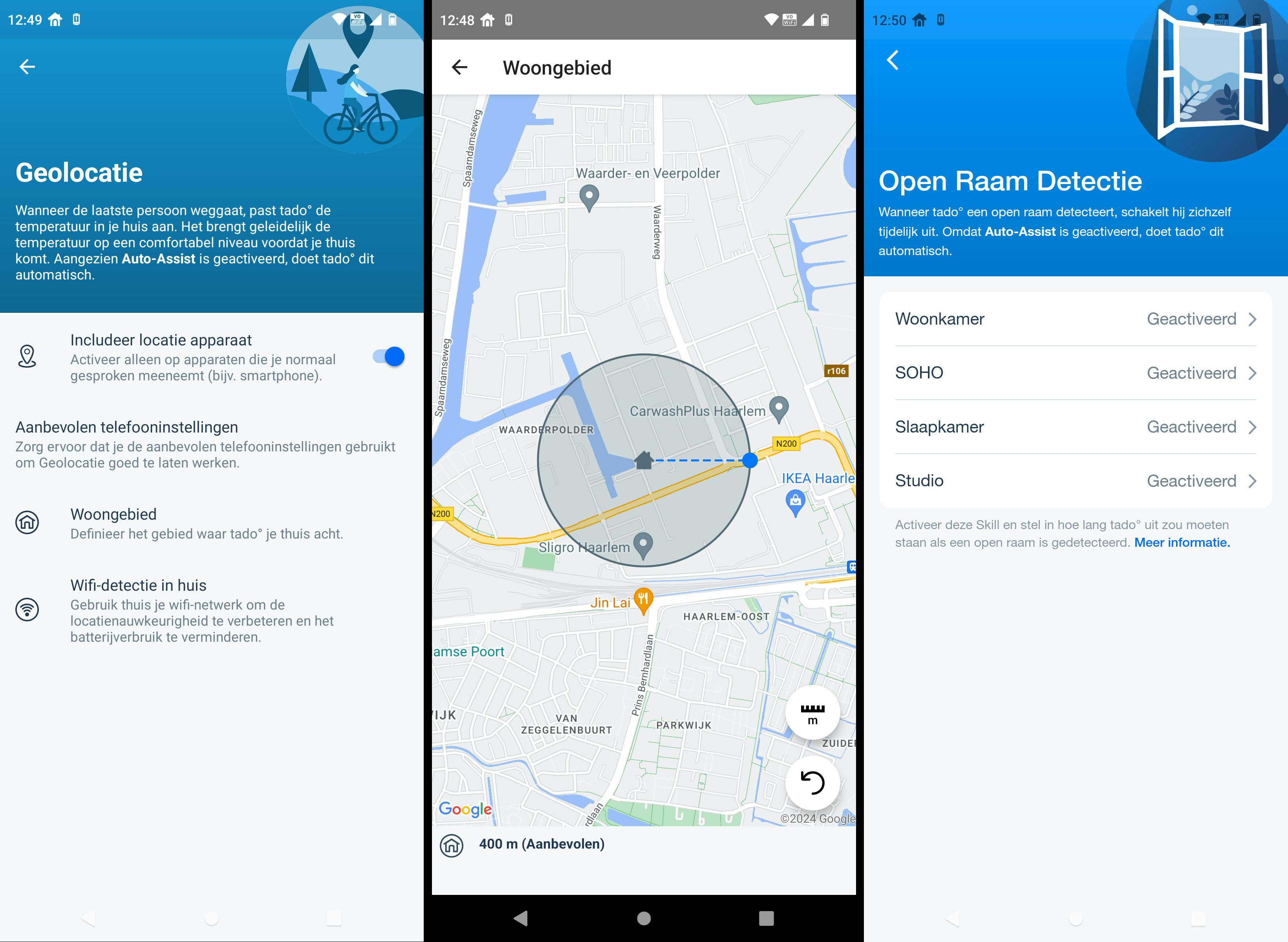 Een mogelijkheid waar Tado om bekend staat, is geofencing – wat door Tado Auto-Assist wordt genoemd. Dankzij je smartphone weet het systeem of je thuis of onderweg naar huis bent en kan het systeem op basis daarvan automatisch de verwarming in- of uitschakelen. Daarnaast kan Auto-Assist ook de verwarming in een kamer automatisch uitschakelen als een open raam gedetecteerd wordt (dit werkt aan de hand van een plotselinge temperatuurdaling). Op dat moment kan de verwarming een bepaalde tijd uitgeschakeld worden om energie te besparen.