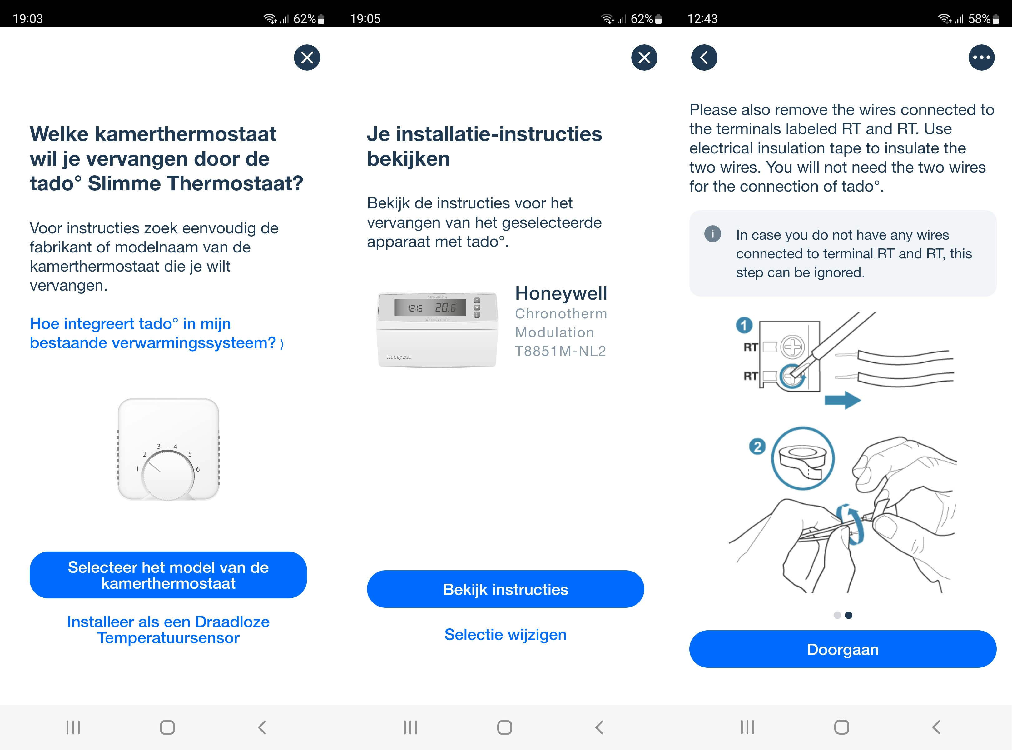Om de thermostaat daadwerkelijk in gebruik te nemen kun je eenvoudigweg opgeven wat voor thermostaat je op dit moment gebruikt. In ons voorbeeld vervangen we een Honeywell T8851M-NL2. Zodra daarom wordt gevraagd schakel je de cv-ketel uit. Daarna haal je de oude thermostaat los van de muur. Bewaar deze goed, je kunt hem dan weer terughangen als je een keer tegen een probleem aanloopt of als je gaat verhuizen. Er zijn stickers met labeltjes bijgeleverd die het aansluiten extra makkelijk maken. Je kunt deze aan de bestaande draadjes vast maken zodat je na het bevestigen van het achterplaatje precies weet op welk kroonsteentje je ze moet schroeven. Het achterplaatje van de Tado schroef je vast aan de muur. Het past precies op de twee bestaande pluggen in de muur van de vorige thermostaat. Ten slotte kun je de thermostaat voorzichtig op dat achterplaatje klikken en de cv-ketel weer aanzetten. Daarmee zal de installatie zijn afgerond.