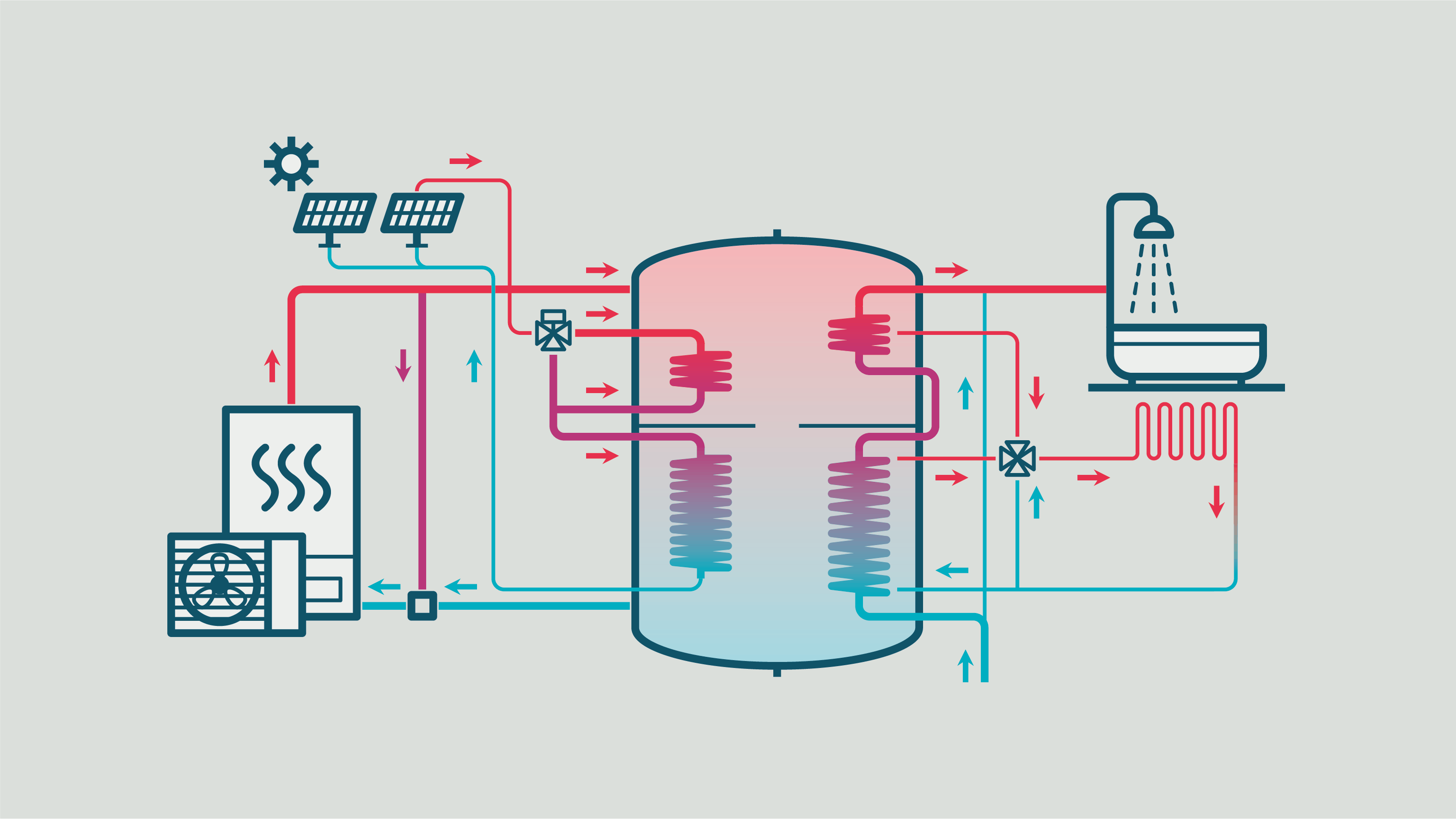 Wil je het pand met verschillende warmtebronnen verwarmen dan kun je een buffervat gebruiken om duurzame energie op te slaan van die verschillende bronnen. Het buffervat wordt dan de warmte-hub. Laten we het voorbeeld nemen van iemand die een warmtepomp samen met zonnecollectoren heeft geïnstalleerd, en misschien is er ook nog een pelletkachel. Om misverstanden te vermijden: met zonnecollectoren bedoelen we thermische zonnepanelen die warmte opslaan en niet de fotovoltaïsche zonnepanelen die gebruikt worden om elektriciteit te produceren.