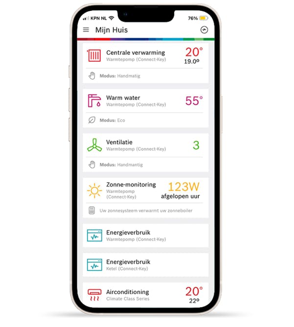 Een mooi voorbeeld is de slimme thermostaat EasyControl, ontwikkeld door Nefit Bosch. De voordelen van een slimme thermostaat, zoals hierboven beschreven, zijn bij uitstek van toepassing op de Bosch EasyControl. Zo kun je de warmtepomp via de app eenvoudig op afstand bedienen en is altijd en overal het stroomverbruik in te zien. Je kunt daarbij ook het energieverbruik van verschillende jaren vergelijken. Daarnaast kun je in de app bijvoorbeeld supereenvoudig een klokprogramma instellen voor de verwarming en ontvang je direct een melding als er een storing is.
