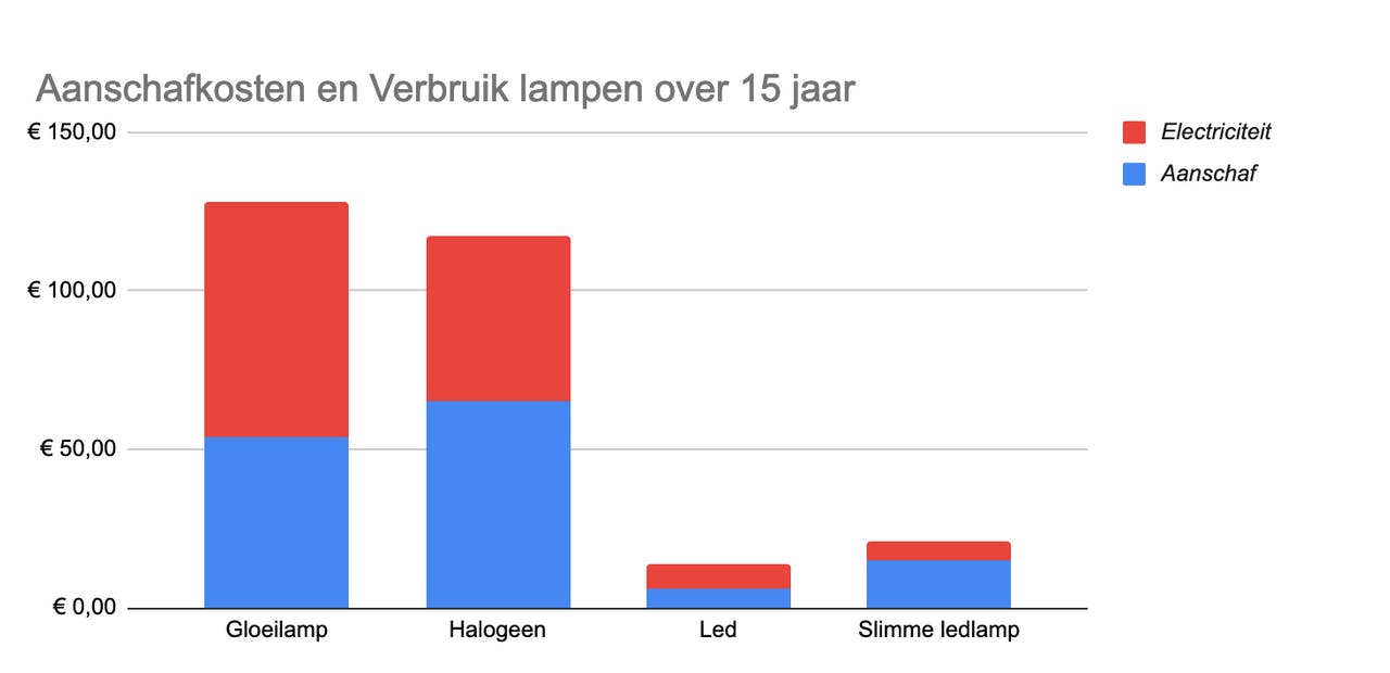 Wij hebben die gegevens uitgebreid met de data voor een slimme lamp. Hierbij gaan we uit van een redelijk gemiddelde lamp met een lichtsterkte van 400 lumen en een elektriciteitsprijs van 22,5 cent per kWh. Daarbij gaan gloeilampen rond 1000 branduren mee. Je hebt er in de vijftien jaar negen van nodig, waardoor de hoge aanschafprijs wordt verklaard. Zo kost de aanschaf en het verbruik van een gloeilamp dus over vijftien jaar rond 128 euro, bij een ledlamp is dat 14 euro.