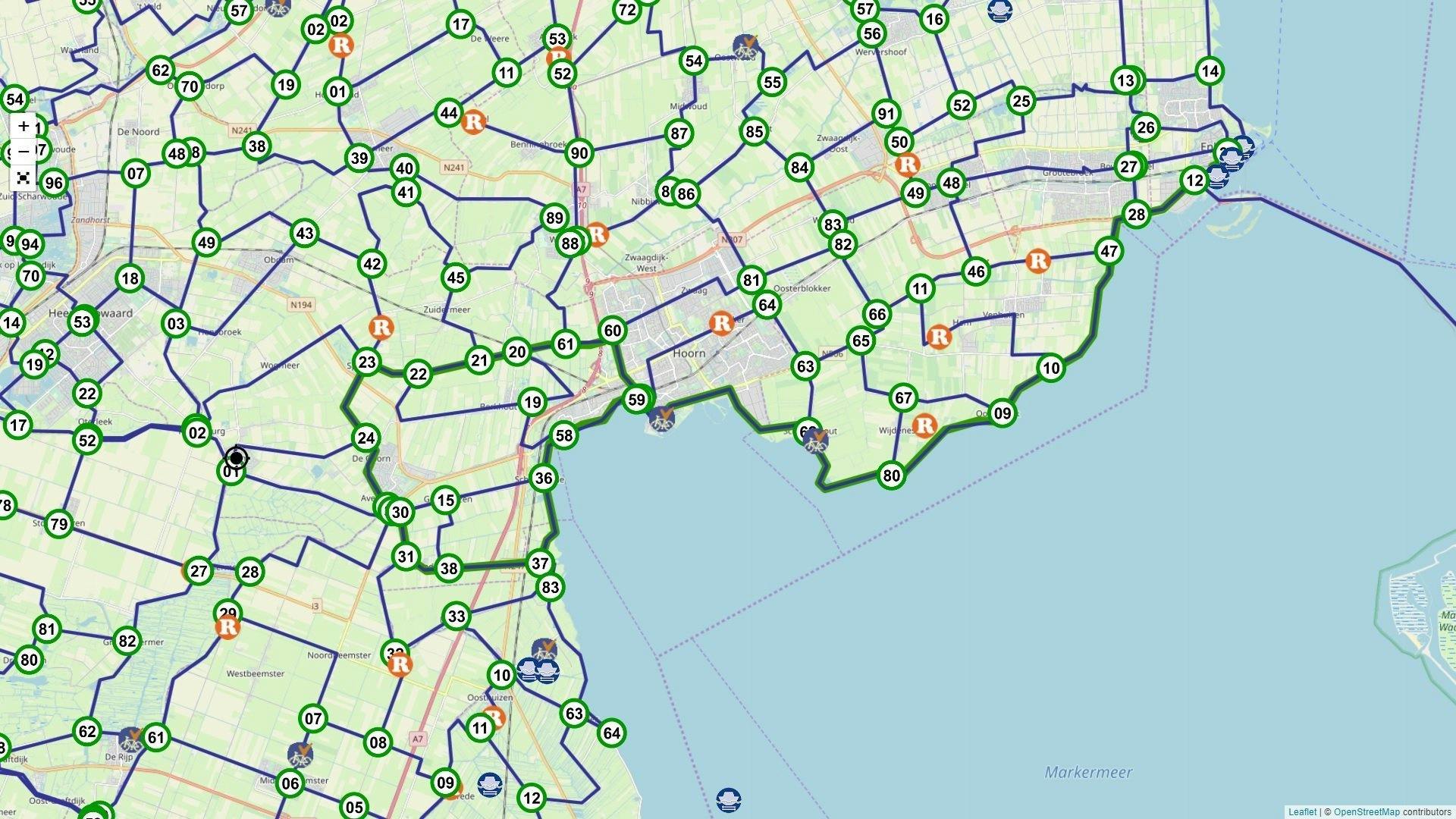 De West Friese Omringdijk kent zijn oorsprong al in de 12de eeuw toen Friesland een steeds dichter bevolkt gebied werd dat bij hevige regen bedreigd werd door het oprukkende water. Destijds verschenen de eerste terpen in het gebied. Vanaf de 16de eeuw kwamen de dijken op hun huidige plaats te liggen. Tegenwoordig voeren de al dan niet aaneengesloten dijken een route van maar liefst 126 kilometer. De dijk doet maar liefst 34 steden en dorpen aan en begint en eindigt bij Enkhuizen. Onze fietsroute over de West Friese Omringdijk start hier wel, maar zal hier niet eindigen. Wij vervolgen onze weg langs het water naar knooppunt 59 in Hoorn.