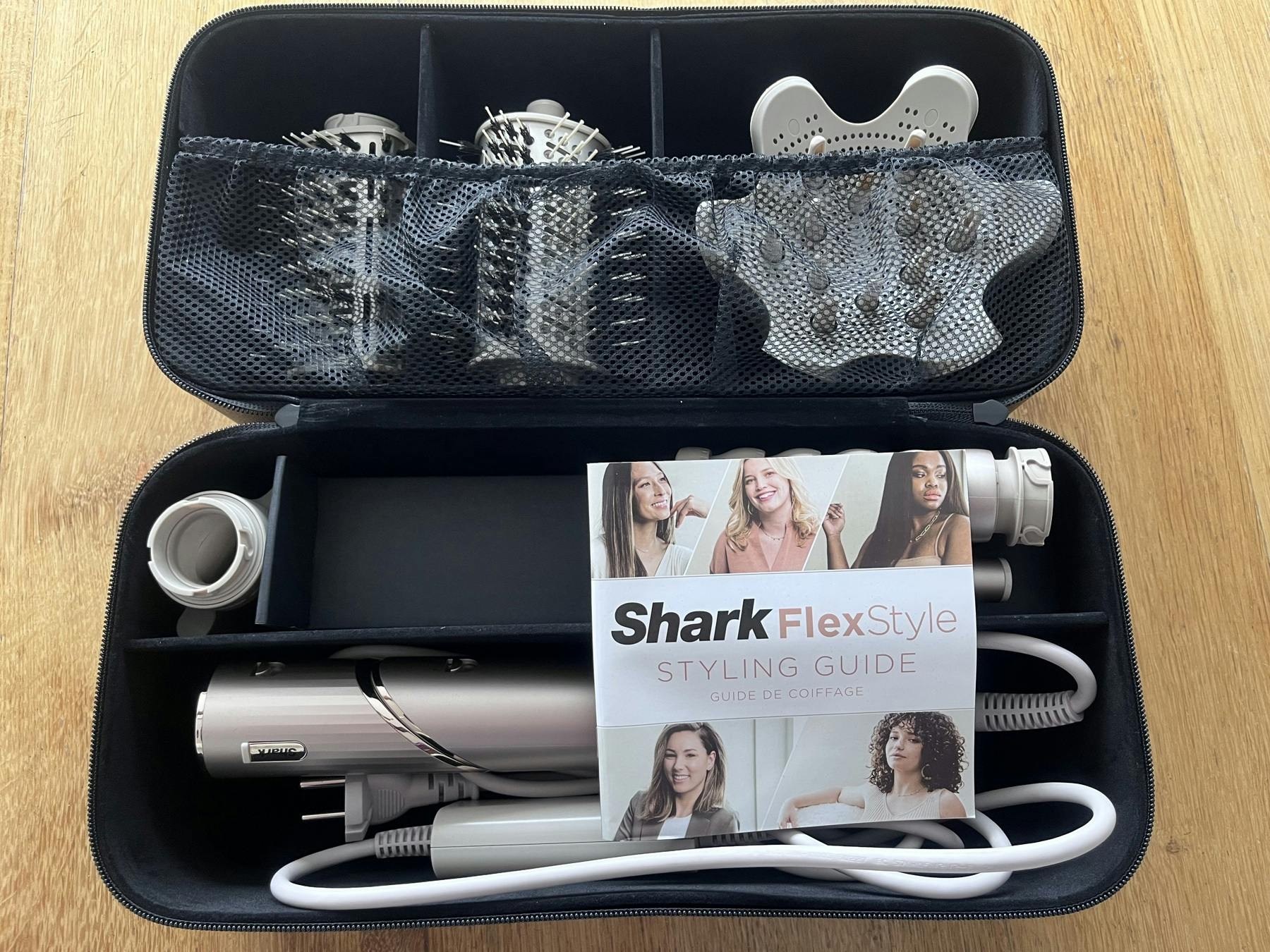 Maar eerst even over de Shark FlexStyle 5-in-1 Föhn en Multistyler. De set bestaat uit een handstuk, twee 32millimeter zogeheten Auto-Wrap-krullers (voor krullen links en rechts van het hoofd), een platte borstel om tijdens het drogen te stylen, een ovale borstel voor volume en glans, een stylingconcentrator voor gericht föhnen en een diffuser met uitschuifbare 'vingers' voor krullend haar. Dit alles met een handleiding, tevens inspiratieboekje, in een luxe zwarte reiscase. Die overigens met alle spullen erin wel draagbaar is, maar niet zo licht dat je hem overal mee naartoe zult nemen.