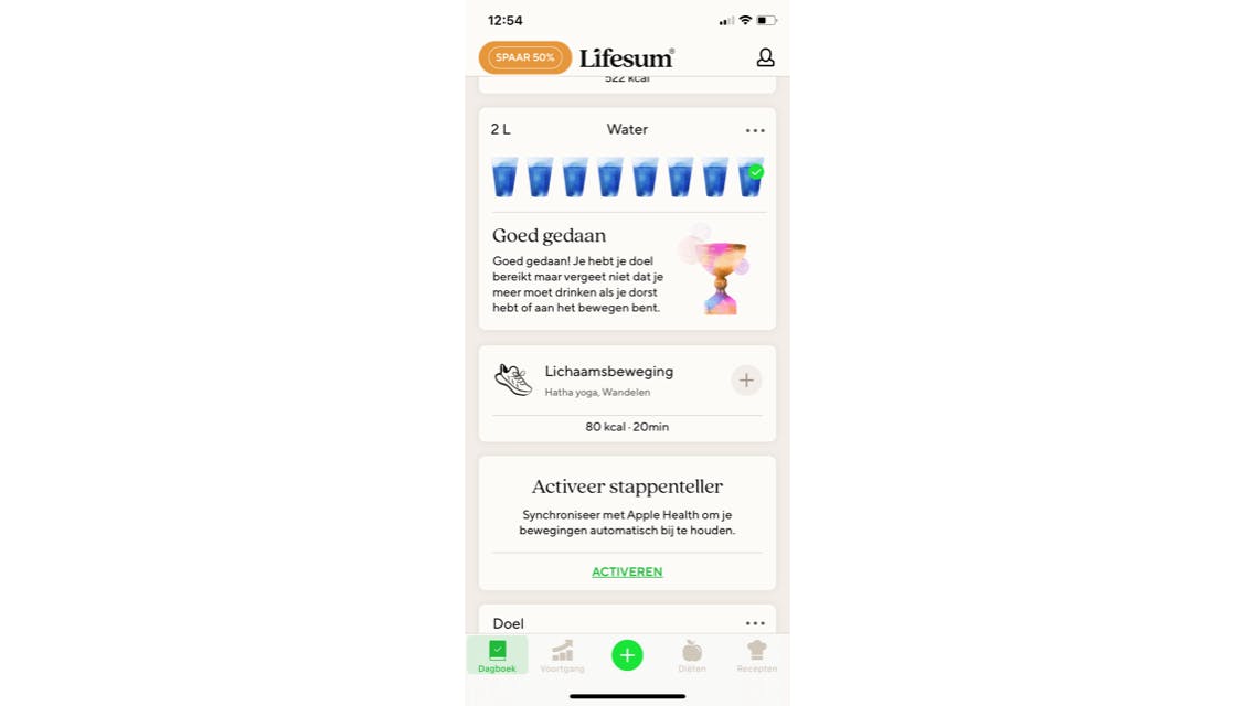 Je voert eerst je gegevens in Lifesum (Apple en Google Play) en wat je streefgewicht is. Ook kun je je lichaamsafmetingen invoeren, zoals tailleomtrek, lichaamsvet, borstomtrek, arm enzovoorts. Je krijgt advies hoeveel calorieën je kunt eten per dag, om in een redelijk tijdsbestek de kilo's te verliezen die je kwijt wilt. Je ziet op welke datum je doel bereikt zal zijn als je de adviezen opvolgt. Vervolgens houd je het eetdagboek bij per dag. Je kunt je opnieuw wegen en je gewicht steeds bijwerken. Het is beter om dat wekelijks te doen dan dagelijks om de trend te kunnen zien.