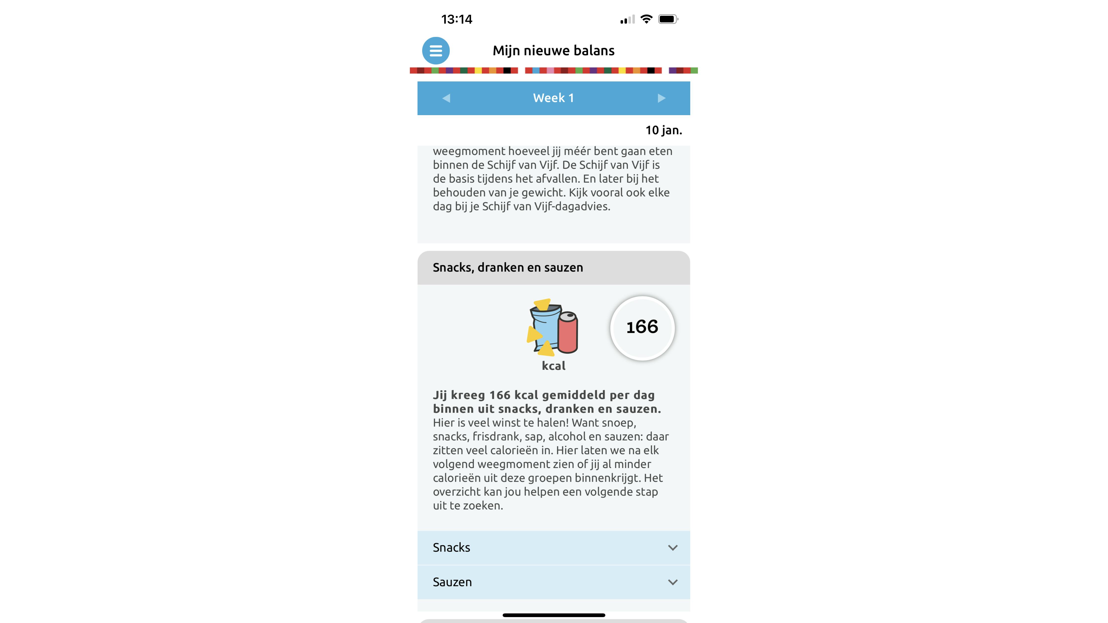 Wel geeft de app aan dat het goed is om een halve kilo per week af te vallen. Je krijgt tips hoe je winst kunt behalen. Het advies wordt gegeven op basis van De Schijf van Vijf van het Voedingscentrum. Je krijgt ook goed advies over de juiste hoeveelheden voedingsstoffen, bijvoorbeeld of je teveel of te weinig vet eet, of dat je meer moet bewegen. Ook krijg je tips als het niet zo goed gaat.