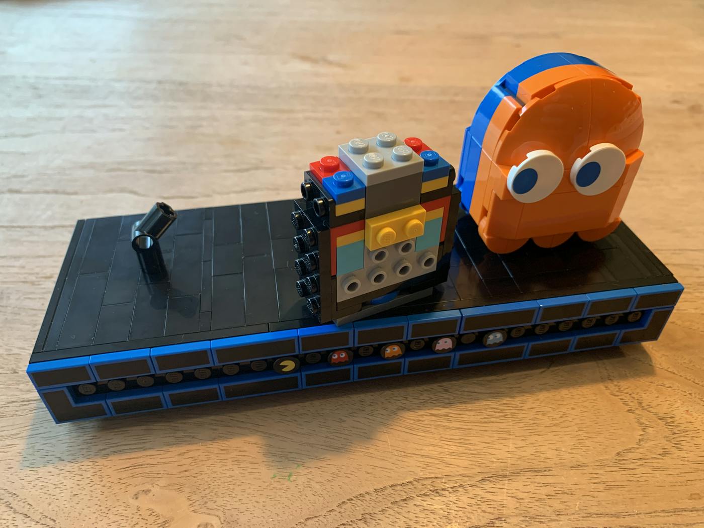 Maar het blijkt ook uit de bouw zelf. Want naast de prachtige printplaat en uiteindelijk de hele speelhalkast zitten er nog twee extra onderdelen in de set. Eén daarvan is een grote Pac-Man met twee spoken (10 x 15 centimeter groot). Een bescheiden aantal raderen onder de figuren zorgt ervoor dat, wanneer je een knop aan de achterzijde indrukt, de drie figuren 180 graden omdraaien. Pac-Man wordt van gejaagde de jager én, net als in de game, het uiterlijk van de spoken verandert. Van gekleurde jagers zijn zij ineens de blauwe gejaagden op de vlucht voor Pac-Man. Dit simpele omkeereffect is briljant in al zijn eenvoud.