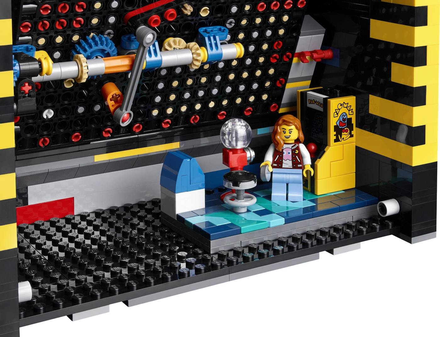 De beweging van de Pac-Man-figureren in het doolhof komt niet van een motor, maar wordt met een kleine zwengel aan de rechterkant van de arcade-kast aangestuurd. Hiervoor worden als 'de printplaat' bijna klaar is aan de achterzijde een klein aantal tandwielen en assen geplaatst. Het werkt probleemloos. Dat er op de doos van de LEGO-set Batteries included staat komt dus niet omdat er hubs of motoren in de set zitten, maar doordat er een Electric Light-brick wordt gebruikt. Dit is een met een kleine LED uitgeruste transparante steen. Deze zit aan de rechtervoorzijde achter het venster bij de sleuf waar je op de originele kast 25 dollarcent moest inwerpen voor de volgende game. Hier niet nodig, maar wel mooi dat ook dit detail het in het LEGO-ontwerp heeft gehaald. Onbekend is hoe lang de LED meegaat en hoe je die ooit moet vervangen. Maar omdat de LED alleen aanspringt wanneer er op een grote knop wordt gedrukt, zal dit wel niet heel snel nodig zijn.