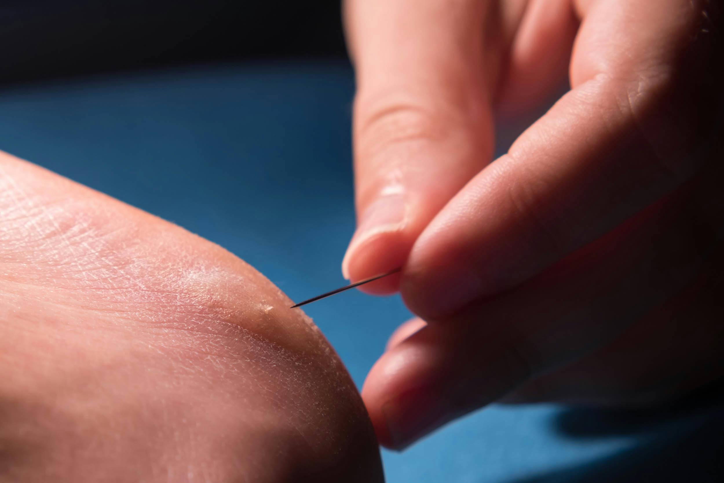 - Prik de blaar door: Gebruik een steriele naald om een klein gaatje aan de rand van de blaar te maken. Druk voorzichtig op de blaar om het vocht eruit te laten lopen.