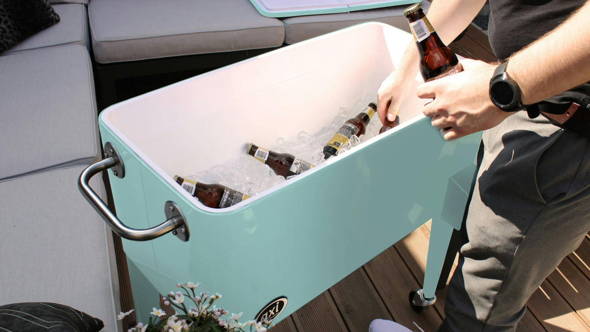 Een tuinfeest is niet compleet zonder drankjes in een bad van ijsblokjes. Je kunt hiervoor een oude zinken kuip of extra grote plantenpot gebruiken, maar deze statafel met geïntegreerde koelbox is er eentje uit de categorie 'twee vliegen in één klap'. Iedereen kan zichzelf zo voorzien van een drankje, zonder op en neer te hoeven lopen naar de koelkast, en qua styling scoor je er ook hoge ogen mee. Een koeler waar je op slag verliefd op wordt, is deze retrokoeler op pootjes, met aftapkraan en in het allermooiste mintgroen. Ik zou ‘m maar aan de ketting leggen...