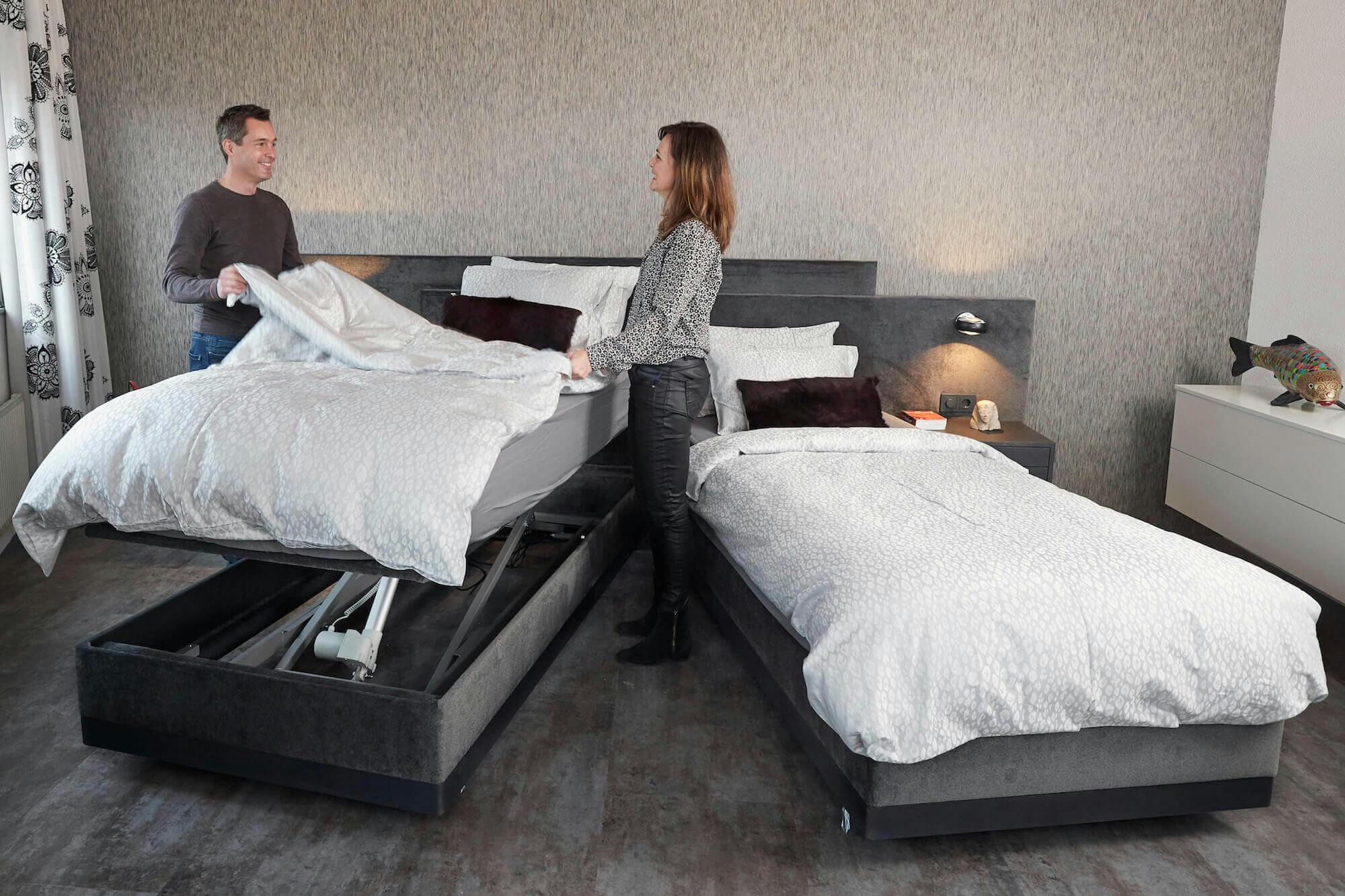 Meestal wordt gekozen voor twee eenpersoons hoog/laagbedden, zodat jij en je partner kunnen kiezen uit het comfort dat het best bij jou en je lichaam past. De twee eenpersoonsbedden hebben losse matrassen en bedbodems die aan elkaar worden gekoppeld, maar ook zo weer los kunnen.