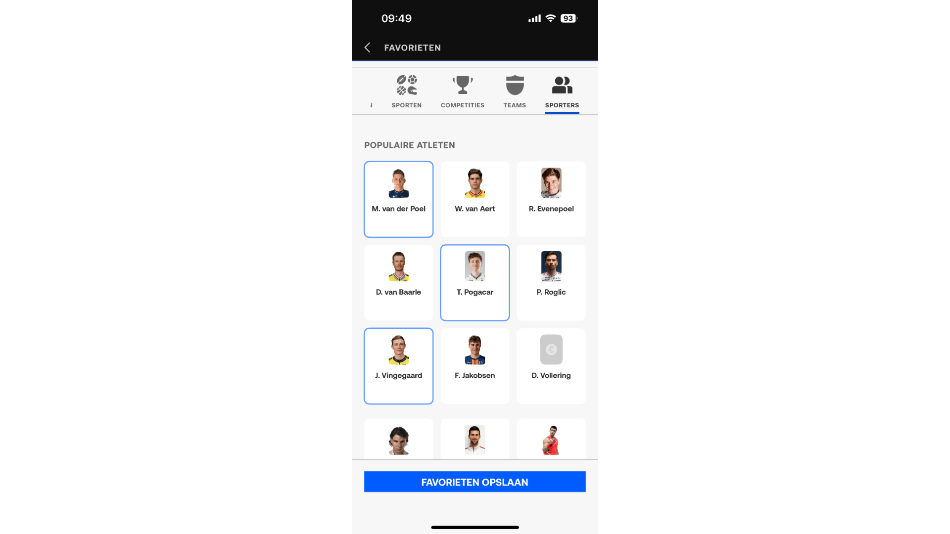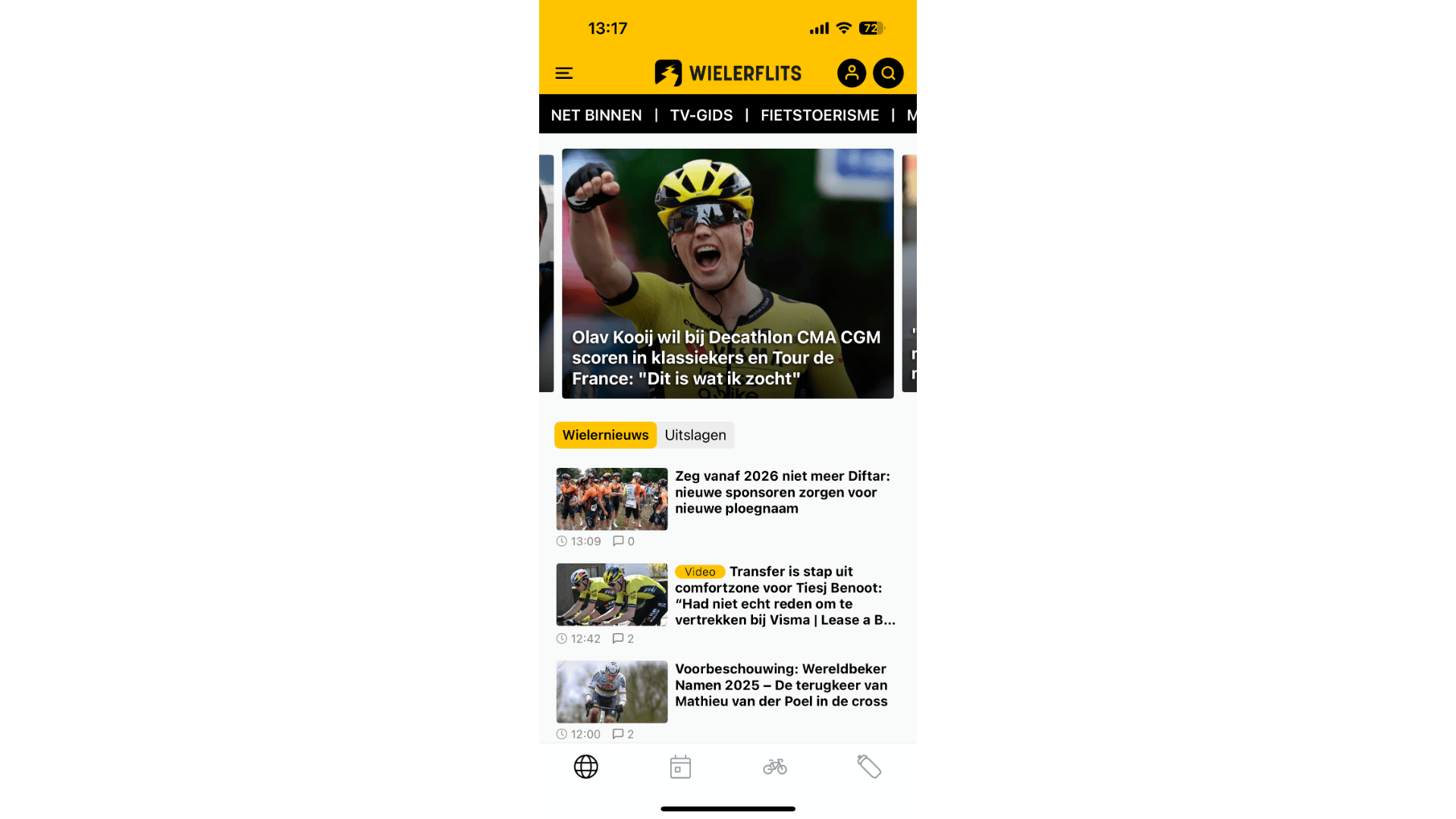 Wie van wielrennen houdt, kan haast niet zonder WielerFlits. Zo bekijk je in de uitgebreide kalender welke professionele koersen er op de planning staan. Verder zie je in de tv-gids of je een bepaalde wedstrijd bijvoorbeeld op Eurosport, VRT 1 of een NPO-zender kunt zien. In het hoofdvenster switch je soepel tussen het laatste wielernieuws en recente uitslagen. Stel ten slotte pushmeldingen in, zodat je direct op de hoogte bent van nieuwe ontwikkelingen over een specifieke koers of wielrenner. Je kunt onder andere notificaties van nieuwtjes over Mathieu van der Poel, Wout van Aert en Tadej Pogačar activeren.