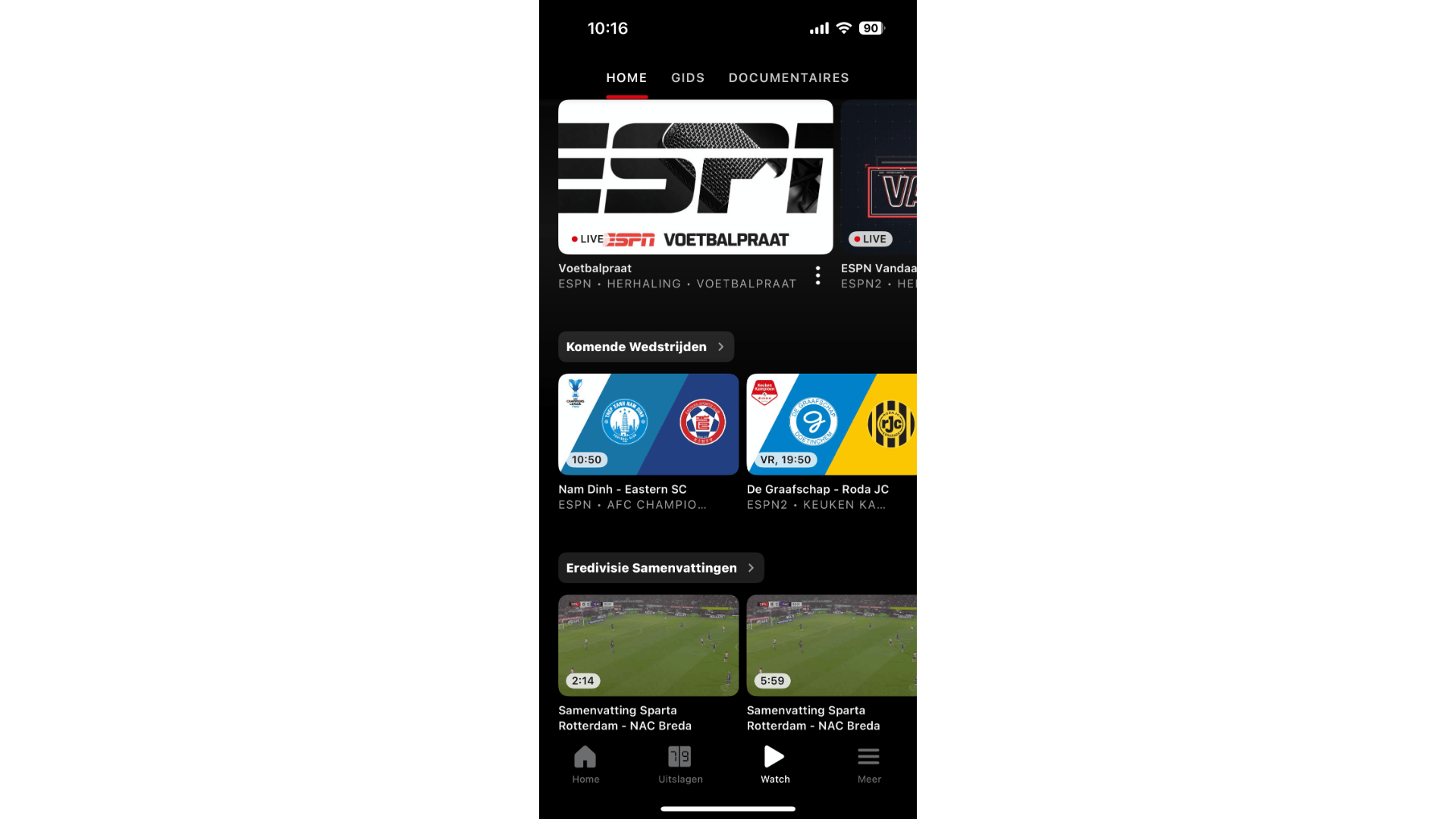 ESPN zendt in Nederland zo’n beetje alle wedstrijden van de Eredivisie en Eerste divisie live uit. De zendergroep beheert ook een gelikte app waarmee je uitslagen en video’s van deze bekende voetbalcompetities kunt bekijken. Je dient hiervoor wel een gratis account aan te maken. Na aanmelding vraagt de app of je nog meer (internationale) competities wilt volgen, waaronder de Premier League, Bundesliga, Champions League, NBA (basketbal) en MLB (honkbal). Bekijk hiervan vervolgens uitslagen, standen en statistieken. In het hoofdscherm lees je voornamelijk recent voetbalnieuws. Je kunt eventueel een andere beginpagina instellen.