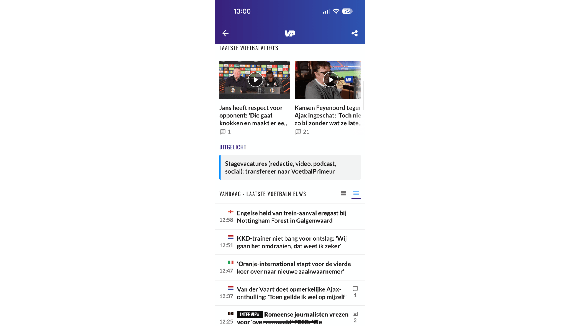 Voetbalprimeur bundelt het laatste nationale en internationale voetbalnieuws in een overzichtelijke gebruikersomgeving. Open deze app en zie dagelijks een waslijst met verse nieuwtjes en videofragmenten. Gebruik het menu om het nieuwsaanbod te sorteren op pakweg transfernieuws, transfergeruchten en algemeen voetbalnieuws. Verder kun je ook de ontwikkelingen van een specifieke club volgen. Voor het checken van uitslagen, statistieken en standen ben je bij Voetbalprimeur eveneens aan het juiste adres. Als je pushnotificaties wilt ontvangen, heb je hiervoor een gratis account nodig.