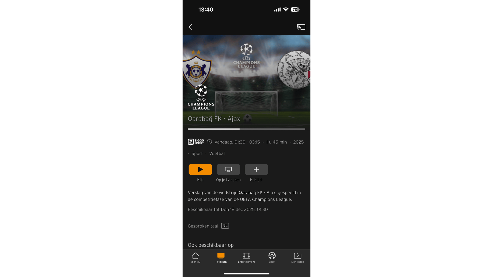Momenteel bezit Ziggo in Nederland de rechten van alle Europese voetbaltoernooien, namelijk de Champions League, Europa League én Conference League. Volgens de mediawet is het bedrijf verplicht om wedstrijden van Nederlandse clubs en de finales gratis beschikbaar te stellen. Om die reden is de Ziggo GO-app ook voor niet-abonnees interessant. Via AirPlay of Chromecast speel je de wedstrijden af op een geschikte televisie of mediaspeler. Registreren is niet verplicht.