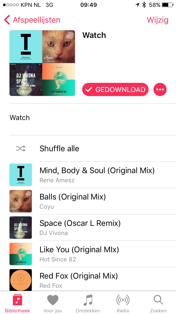 Eerst zet je de muziek die je op de Watch wil zetten op je iPhone. Dit doe je met iTunes. Doordat je alleen afspeellijsten kan synchroniseren, zet je de individuele nummers die je op je Apple Watch wil zetten in een aparte afspeellijst. Voor het gemak hebben we de afspeellijst die we op onze Watch willen zetten ook 'Watch' genoemd.